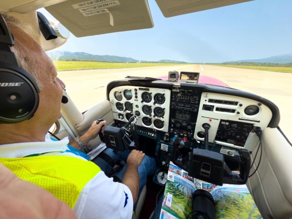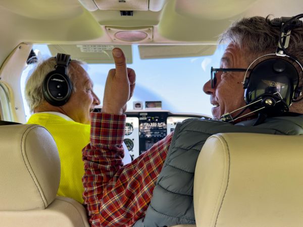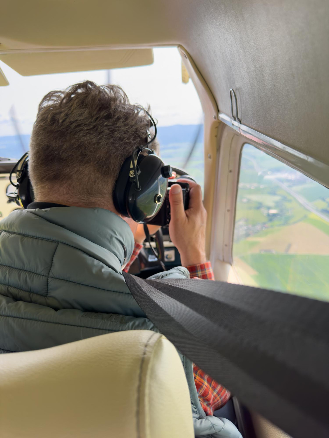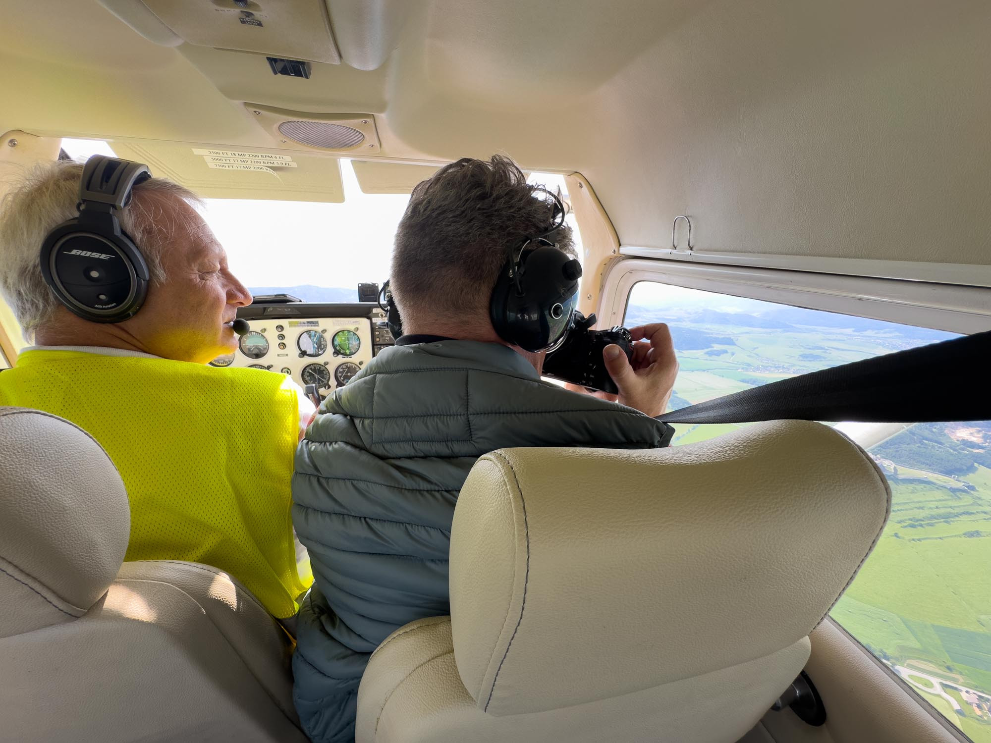 Kurz nach 9 Uhr geht es los. Der nette Pilot „Marian“ begrüßt uns, wir müssen mit all unseren Sachen durch die Sicherheitsschleuse. Personalausweise zeigen/hinterlegen? Fehlanzeige! Was machen die nur, wenn mal eines der Flugzeuge abstürzt? Die wissen doch gar nicht, wer da drin gesessen hat …