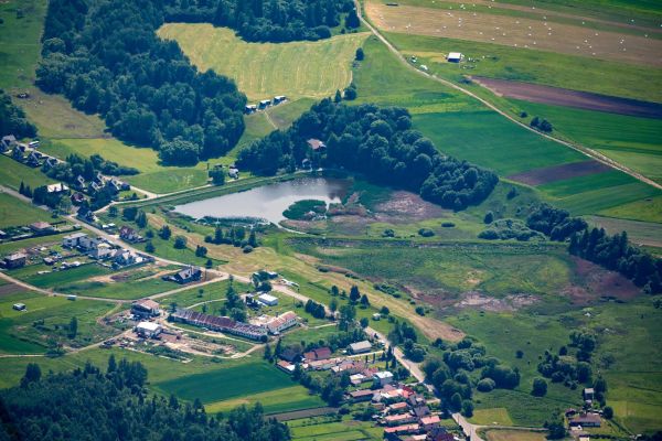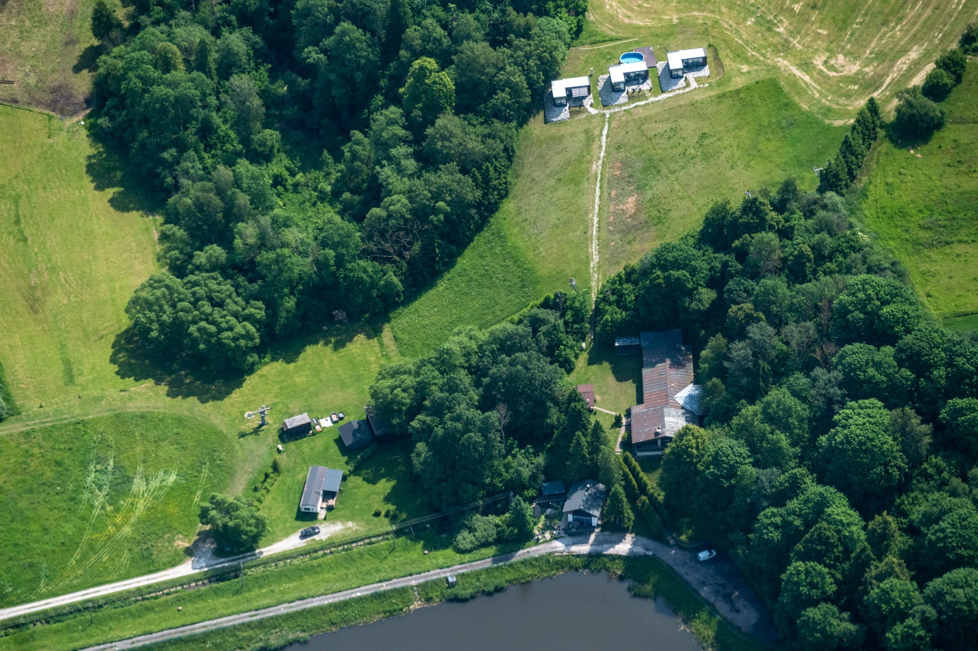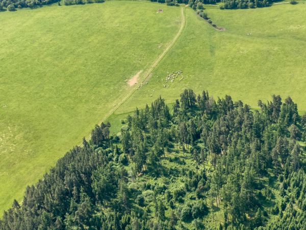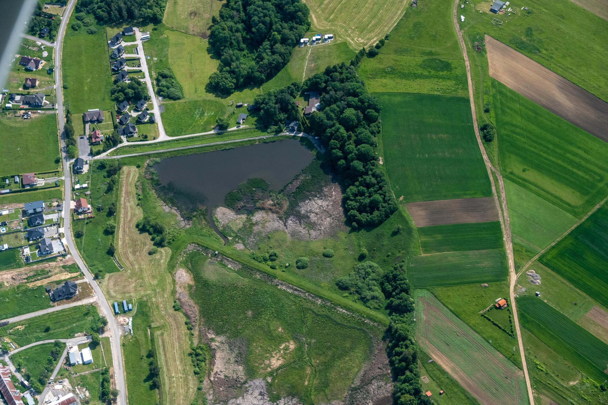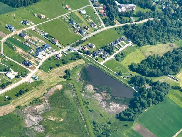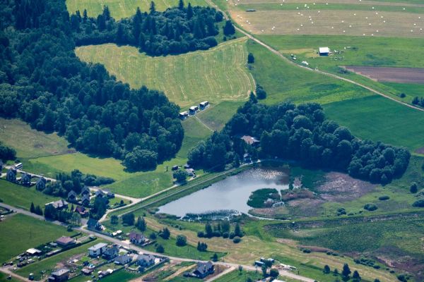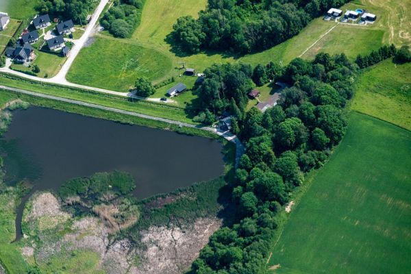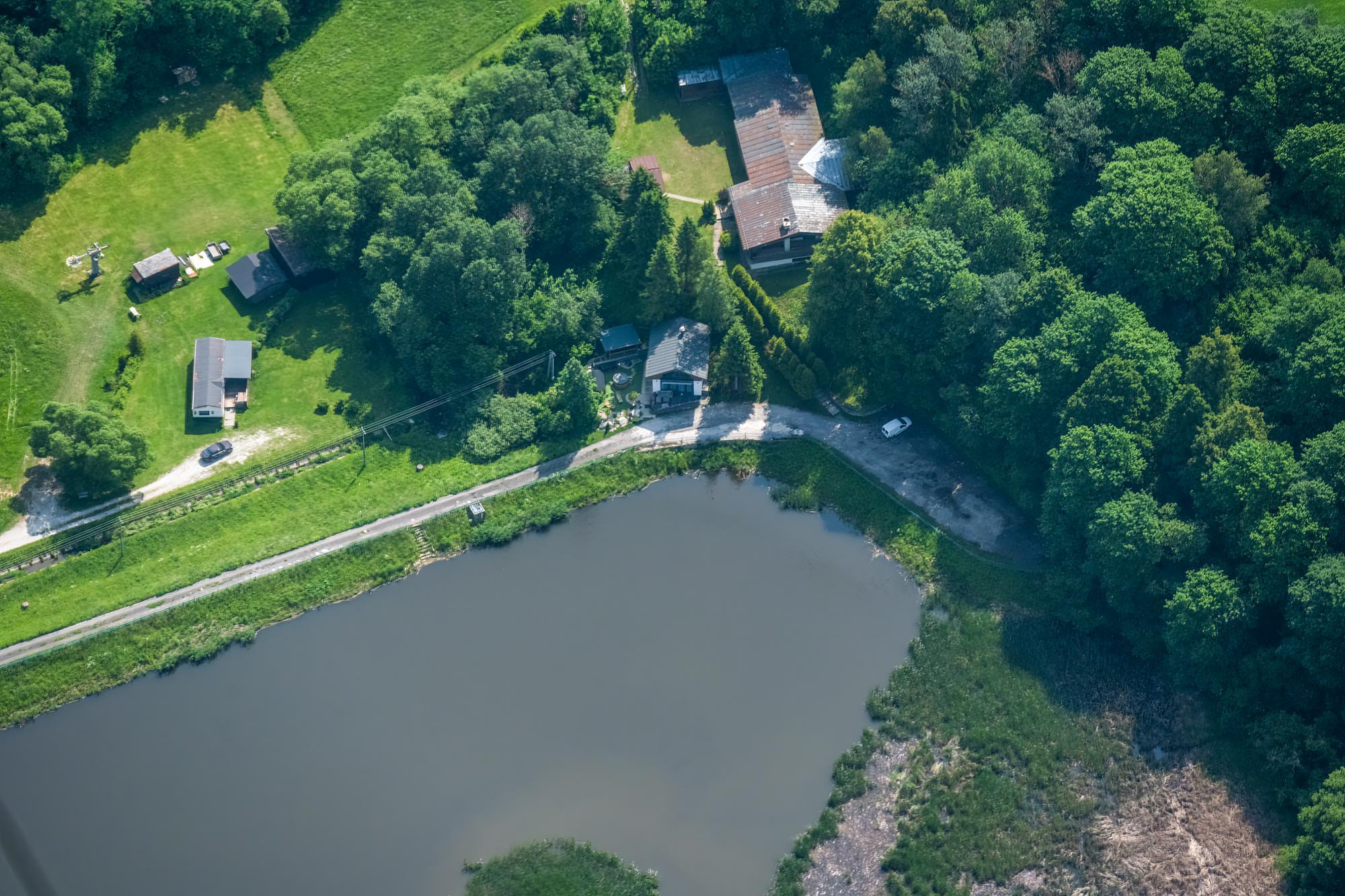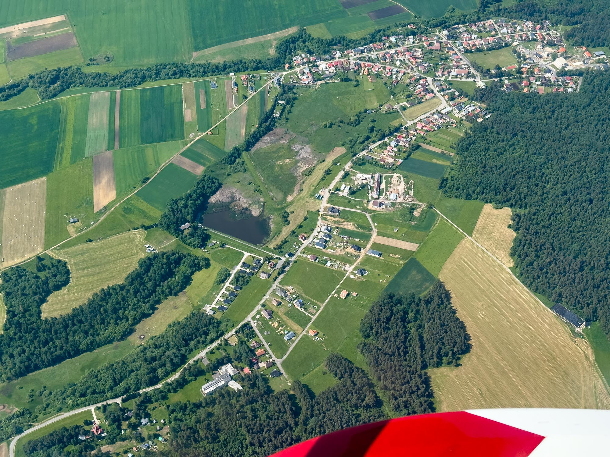 Dann überfliegen wir unser kleines Örtchen „Mühlerchen“. Wir sehen unser Haus am Ende des Damms, den kleinen Teich und unser Hunde-Spaziergeh-Störche-und-Füchse-Beobachtungs-Gelände von oben.