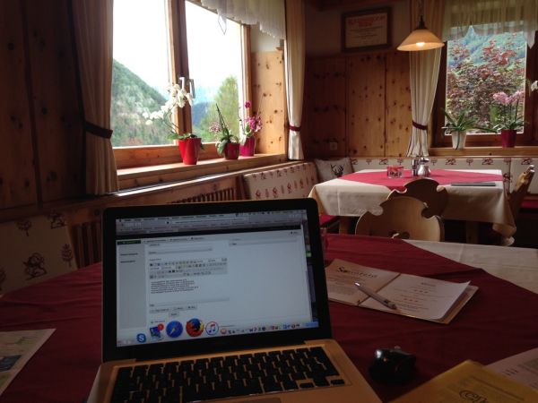 Auch ich setze mich unter den Bedingungen gern für zwei Stunden an den Mac und verrichte mit Blick auf die Berge noch notwendige Arbeiten an unserer Apotheken-Webseite und am Apotheken-Screen.