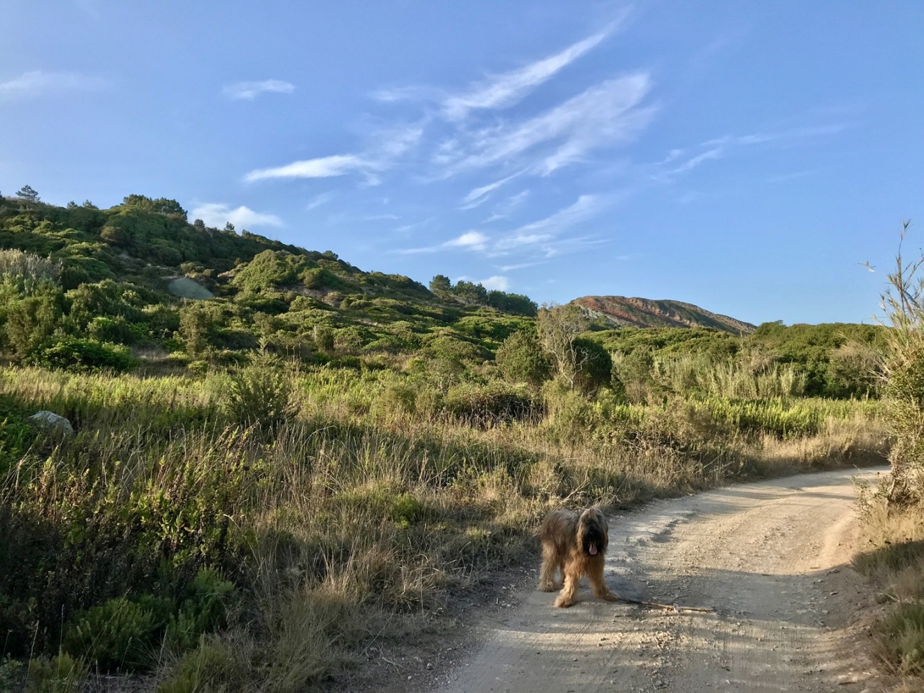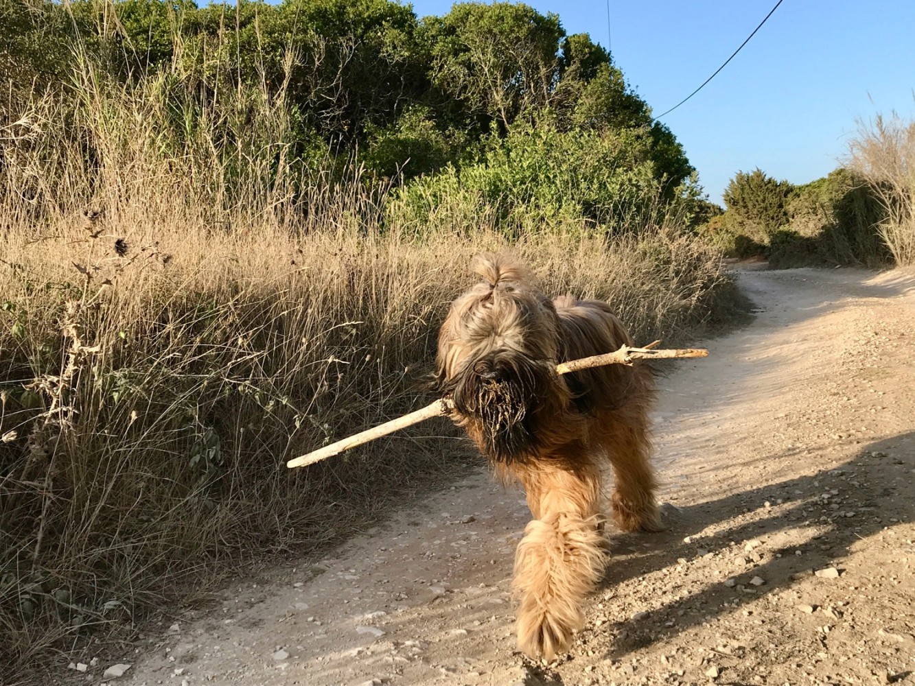 Heute Morgen ist zur Abwechslung mal kein Strand angesagt, Archi verträgt das Salzwasser nicht so gut, daher haben wir ihm Strandpause verordnet. Also nehmen wir den Weg hinter unserem Haus, der aber auch parallel zum Meer verläuft. Archi findet auch hier seine Stöckchen zum Toben und der staubige Weg hinterlässt deutliche Spuren an seiner Schnauze.