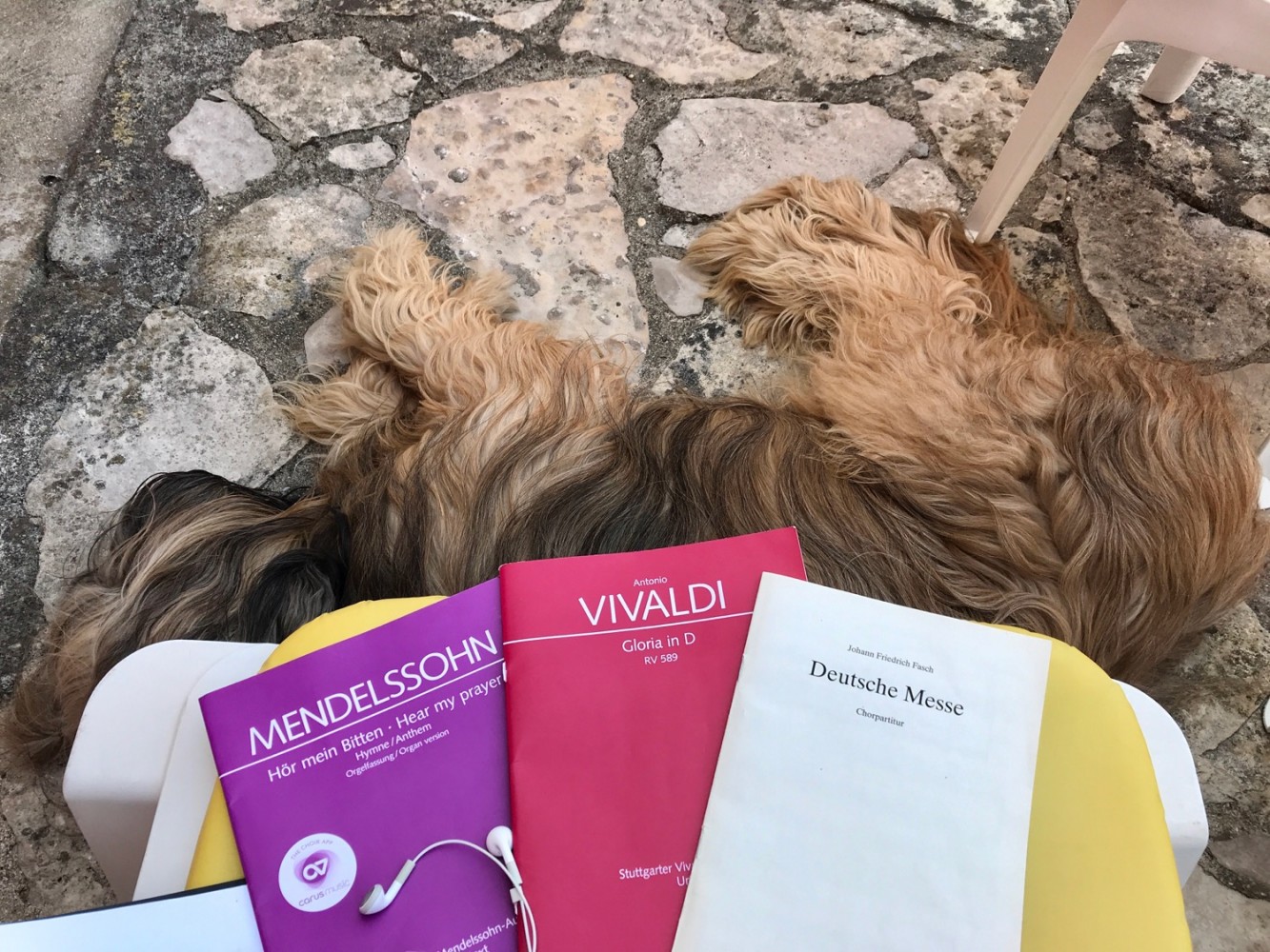Nach der Morgenrunde frühstücken wir zum ersten Mal und sehr ausgiebig auf unserer Terrasse, heute ist es schon früh warm genug dafür. Und wir beschließen den Tag einen „Terrassentag“ werden zu lassen. Archi sichert sich seinen Platz in der ersten Reihe und hört geduldig Frauchen bei ihren Übungseinheiten zu. Hendrik „computert“ und kann mal ungestört Sachen aufarbeiten, die in der letzten Zeit liegen geblieben sind. Beim Mittagessen „nervt“ uns dann der Gärtner mit seinen Mäh- und Schneidearbeiten, sodass wir uns kurzer Hand nach drinnen verziehen bis er mit seinen Arbeiten fertig ist.