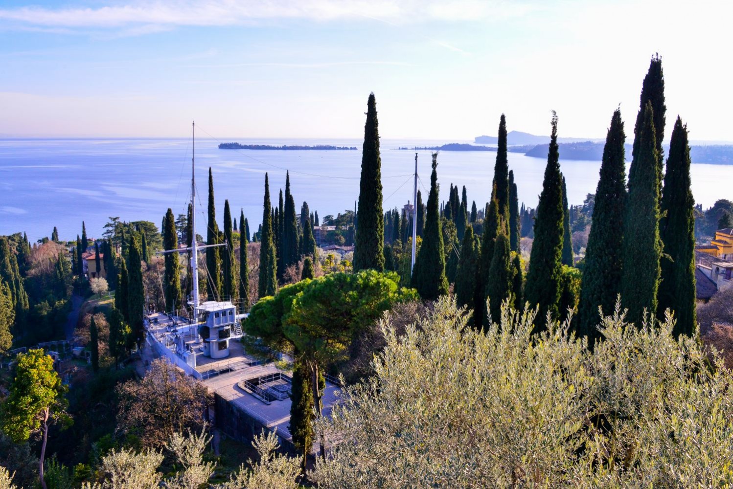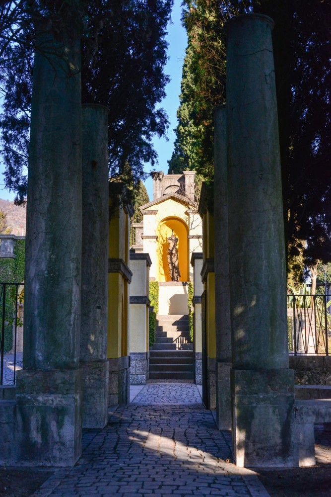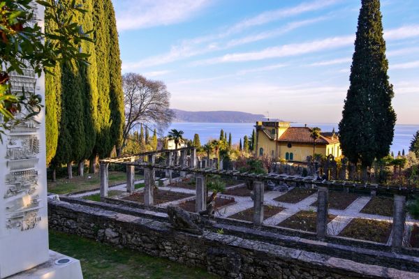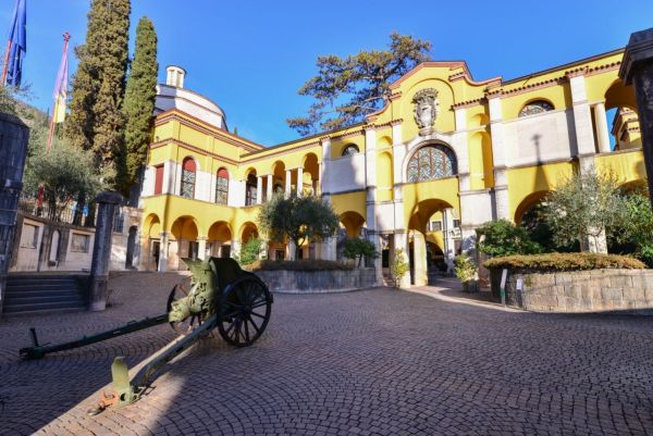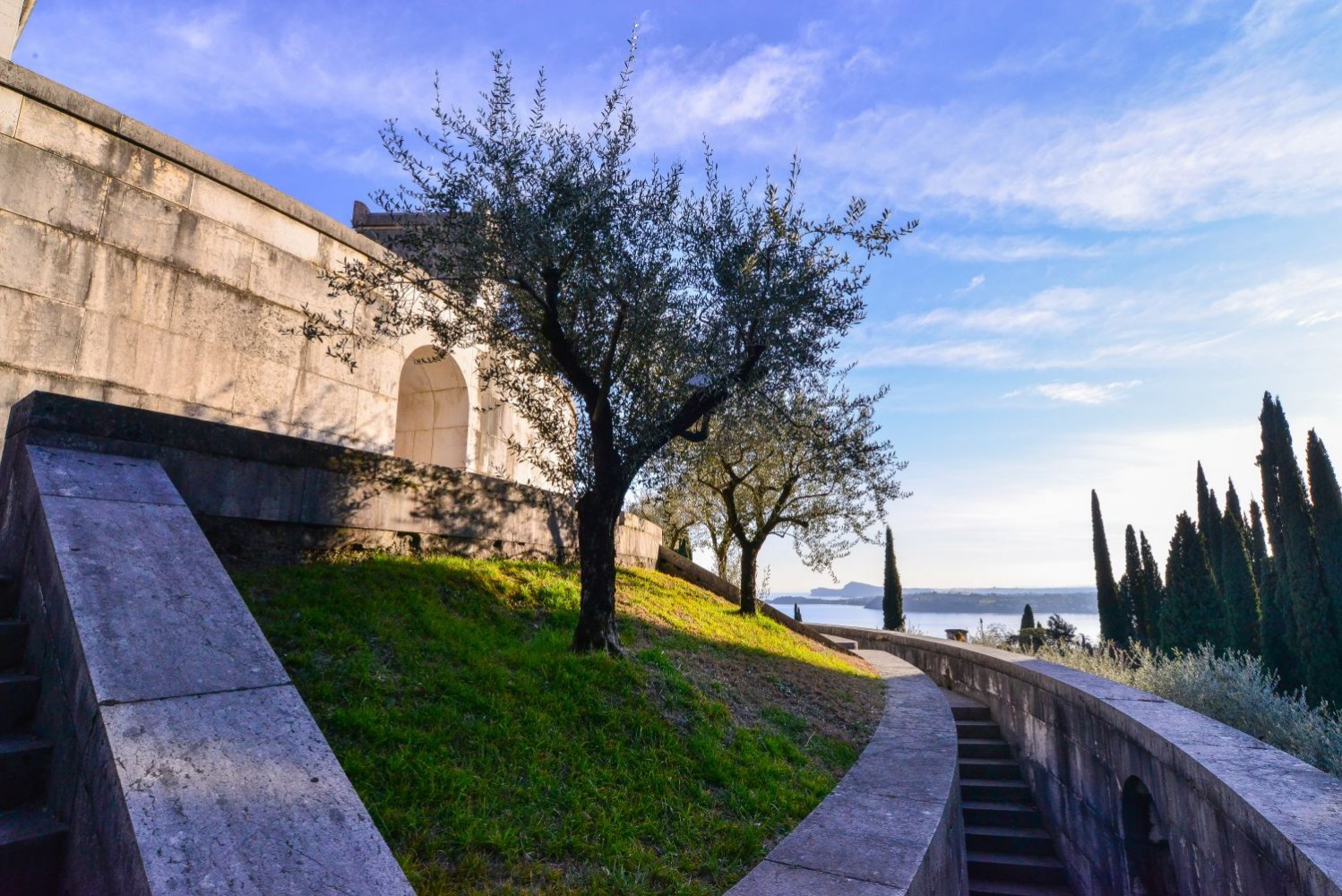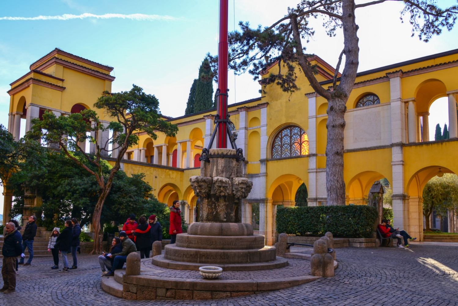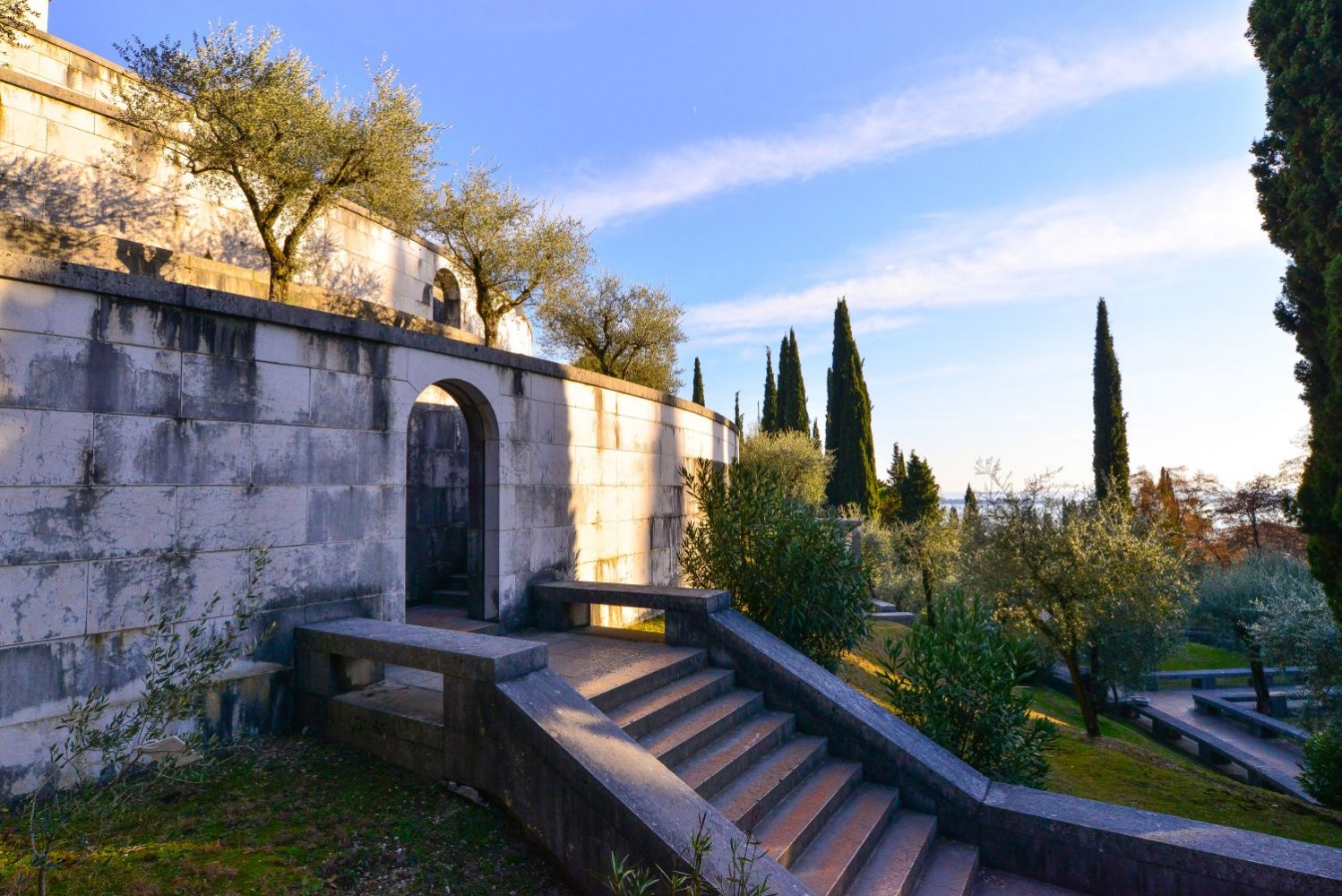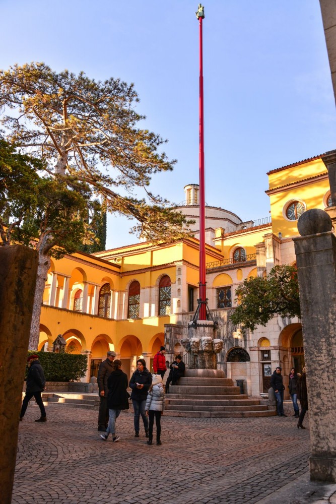 Unweit, genauer gesagt nur einen Ort weiter in Gardone Riviera, gibt es einen versteckten aber interessanten Museumskomplex, den „Vittoriale degli italiani“, deutsch etwa: „Siegerdenkmal der Italiener“ (Foto 1). Er ist der ehemalige Wohnsitz des italienischen Schriftstellers Gabriele D’Annunzio. Dieser ließ das Anwesen ab 1921 gestalten. Heute umfasst das parkähnliche Gelände neun Hektar und besteht aus Gebäuden, einem Freilichttheater, aus Gärten, kleineren Parks, Plätzen und Wasserspielen.