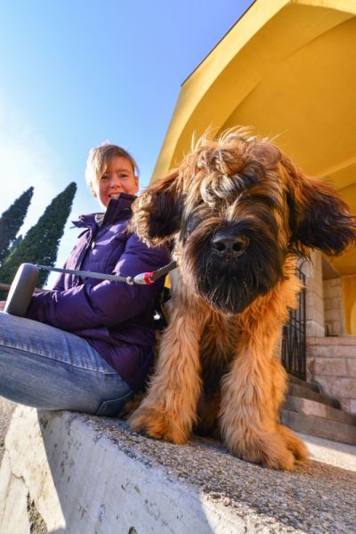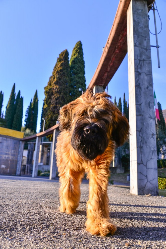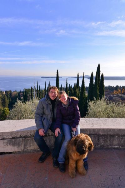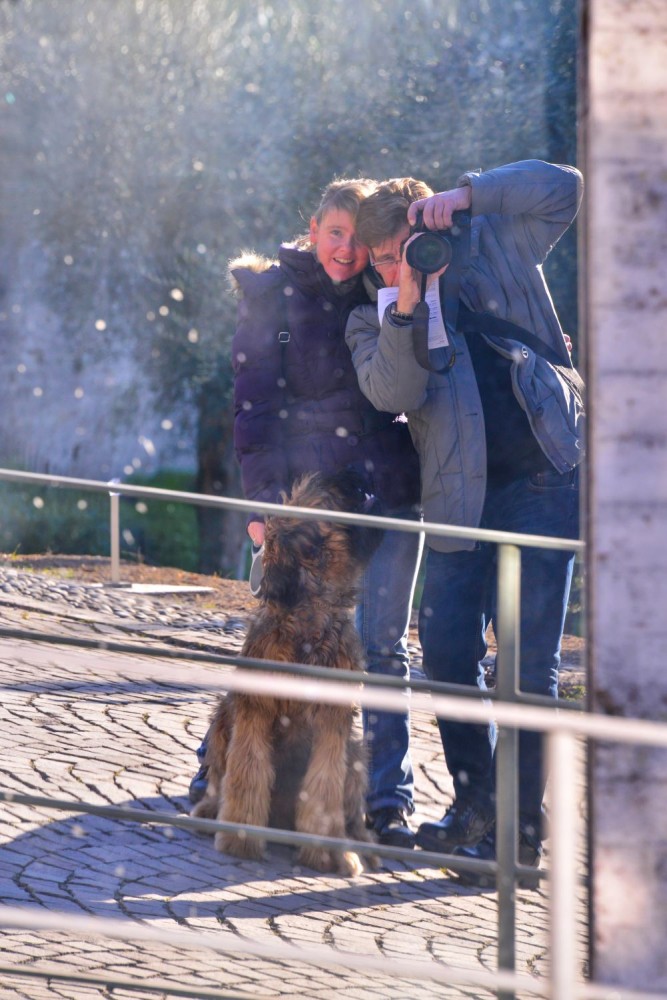 Wir genießen die warme Sonne auf dem und den atemberaubende Blick vom Mausoleum (Fotos 27 – 30) ... und finden jemanden, der uns drei knipst (Foto 31). Es ist schon relativ spät am Nachmittag und es dauert nicht mehr lange, bis die Sonne weg ist. Wir gehen über die Villa mit ihrem schicken Innenhof langsam zurück (Fotos 32 – 35) und unser Archibald findet die übergroßen Hundehütten im sogenannten Hundezwinger recht schick (Foto 36). Die letzten Sonnenstrahlen begleiten uns in der wunderschönen Parkanlage (Fotos 37 – 41) und Hendrik bekommt noch ein wunderschönes, aber wieder etwas kitschiges Motiv vor die Linse (Foto 42). Dann geht es über das Freilichttheater wieder zurück und Archibald fühlt sich mit uns sichtlich briardwohl (Fotos 43 & 44).