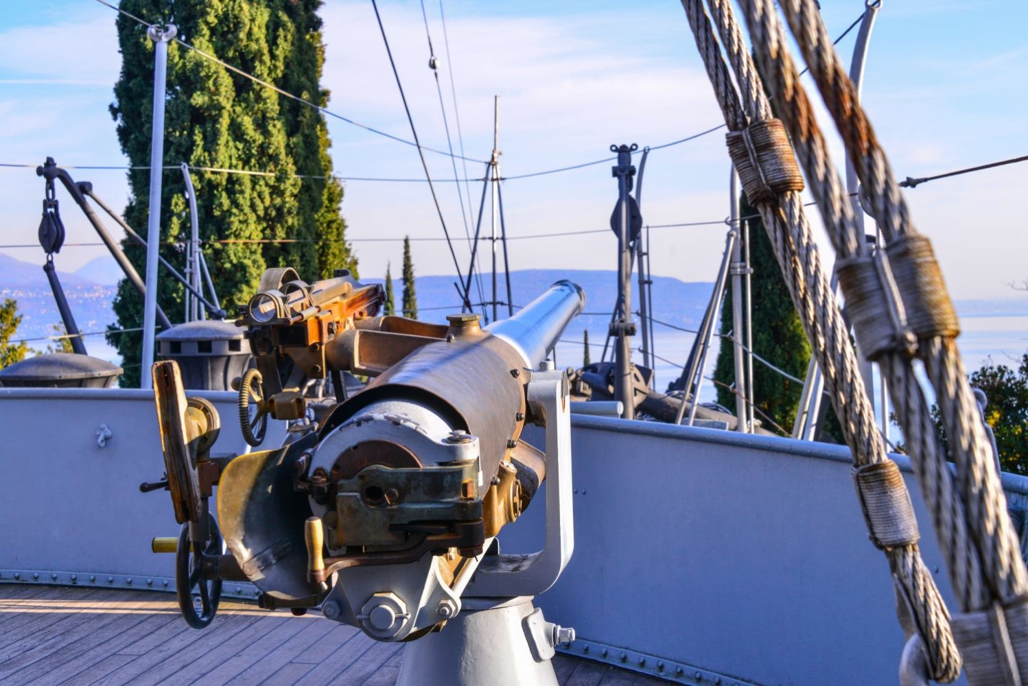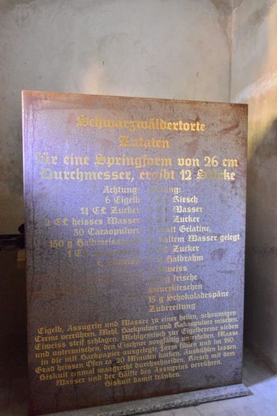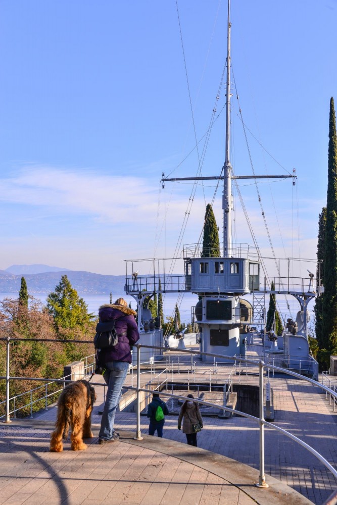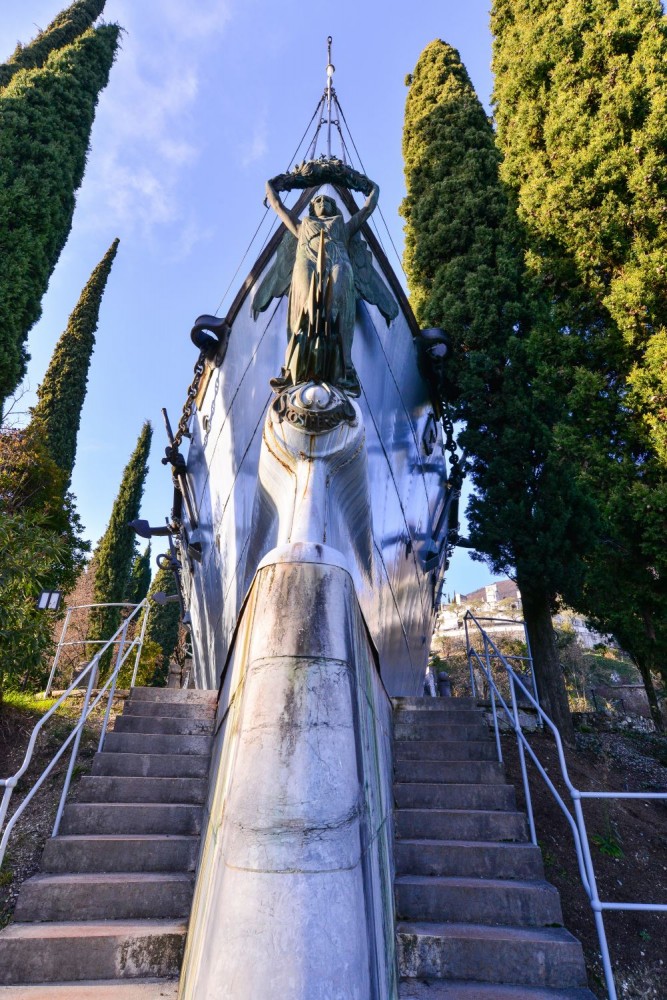 Staunend stehen wir als nächstes vor einem riesigen Schiff, der Puglia. Und das, wo hier doch weit und breit kein Wasser ist. Die Puglia ist ein Kreuzer, den D’Annunzio 1923 von der italienischen Marine als Geschenk erhielt. Er wurde auf 20 Eisenbahnwaggons verteilt angeliefert und bis 1925 auf dem Hang La Fida aufgestellt (Fotos 13 – 17). Wir sind ziemlich beeindruckt ob des riesigen Schiffes, dass hier schon seit fast 100 Jahren wie selbstverständlich auf dem Trockenen und eingebettet in die zauberhafte Landschaft liegt. Vom Kreuzer aus haben wir außerdem einen tollen Blick auf den Gardasee. Im Bordmuseum gibt es noch viel zu entdecken (Foto 18), auch Kunst ??? (Foto 19) und eine in eine riesige Steinplatte gehauene Backanleitung für Schwarzwälder Torte (Foto 20) darf auf einem Kriegsschiff natürlich nicht fehlen … Man(n) ist das abgefahren.