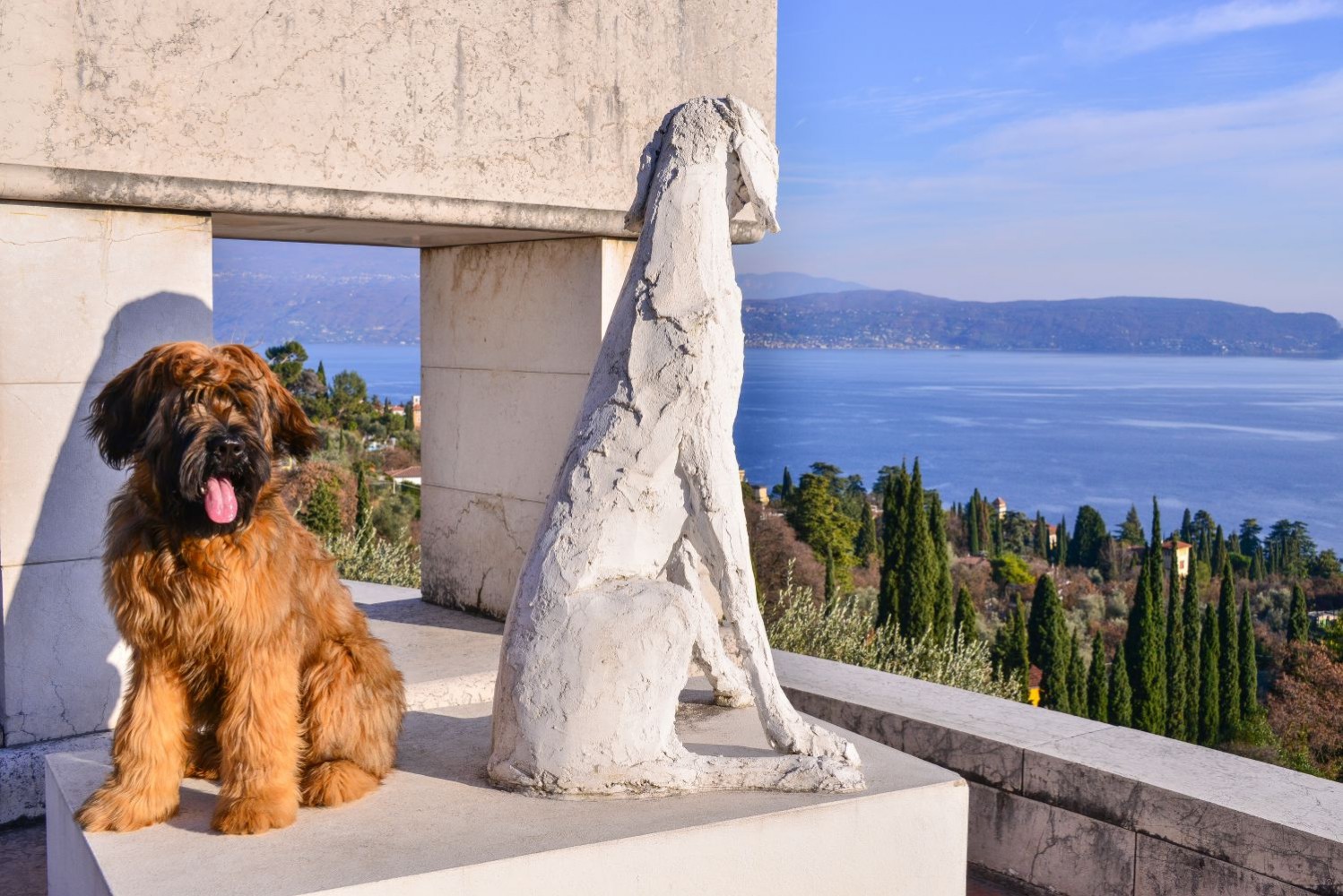 Über etliche Stufen gelangen wir zum Mausoleum (Fotos 23 & 24) mit seinen drei konzentrischen, übereinander liegenden Steinrampen. Dieses wurde ein Jahr nach D’Annunzios Tod entworfen und 1955 auf einer Anhöhe des Vittoriale errichtet. Es lehnt sich stilistisch an etruskisch-römische Grabstätten an. Der Sarkophag D’Annunzios steht auf vier Säulen in der Mitte der obersten Plattform (Foto 25), seine sterblichen Überreste wurden 1963 hierher überführt. Archibald staunt über seine steinernen Artgenossen wohl nicht schlecht (Foto 26).