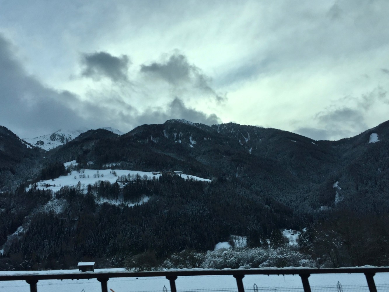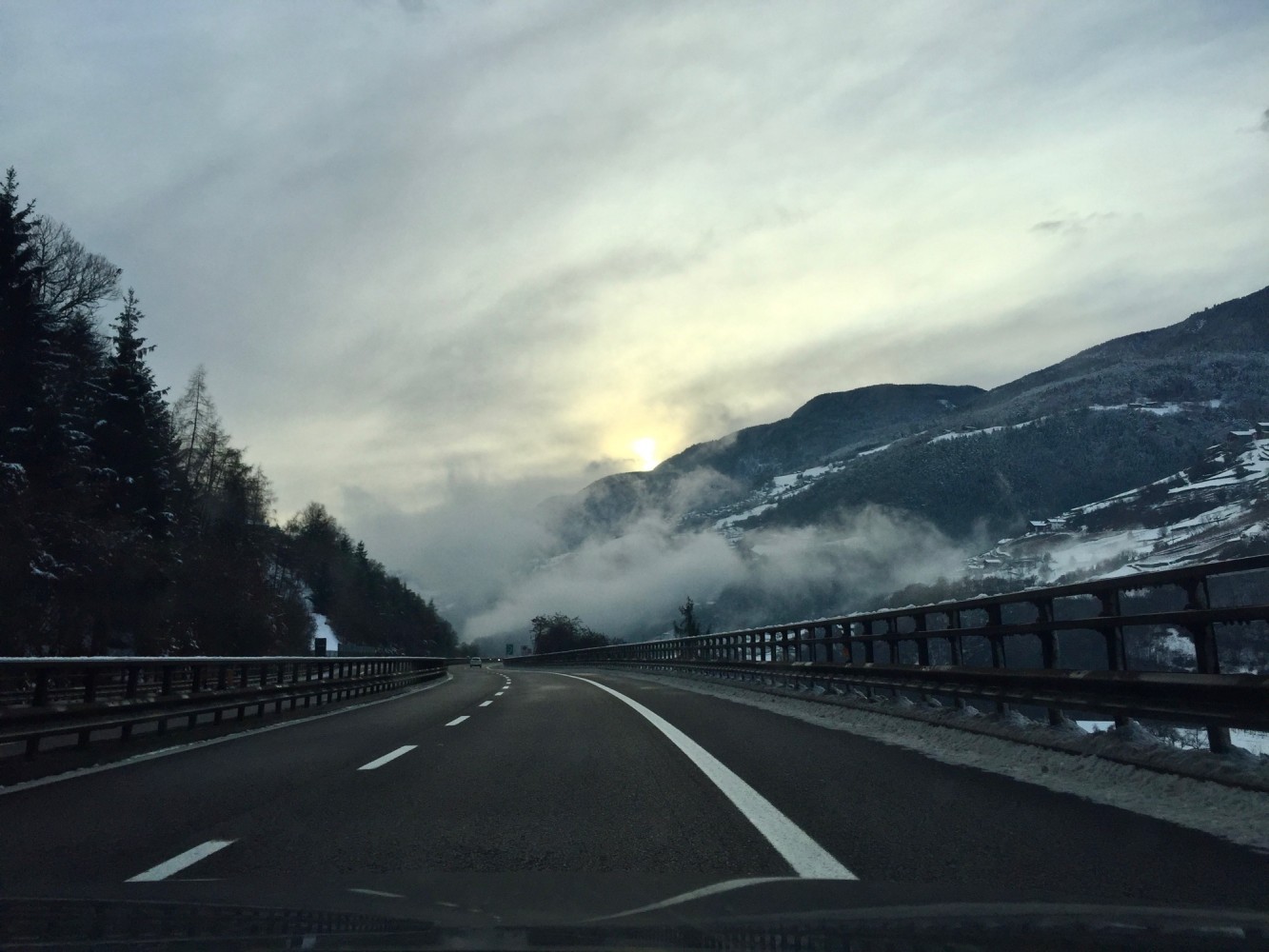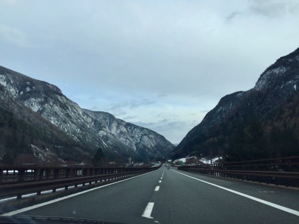 Ansonsten ist es rechts und links der Brenner-AB verschneit. Nur langsam wird der Schnee weniger. Ein wenig blau verirrt sich sogar am meist grauen Himmel und stellenweise hängen sonderbare Wolkenfetzen im Tal fest.