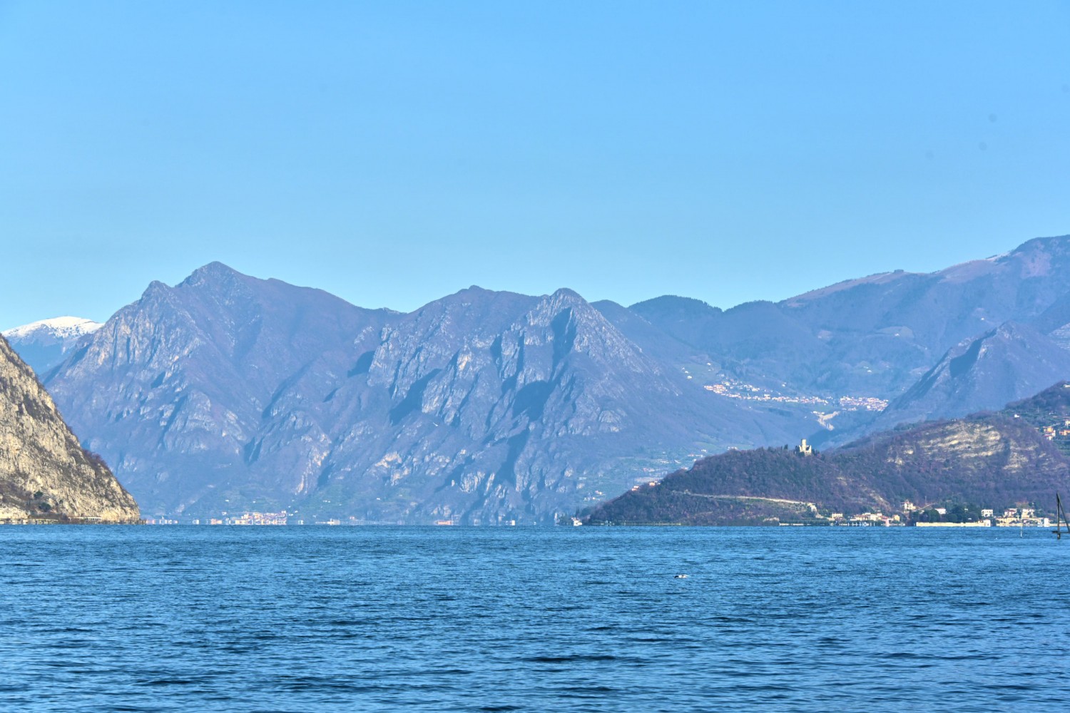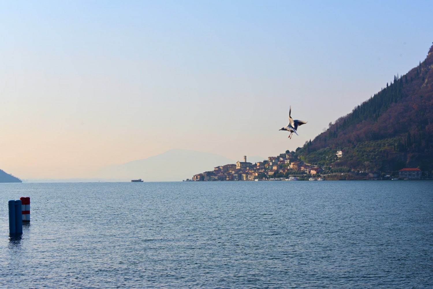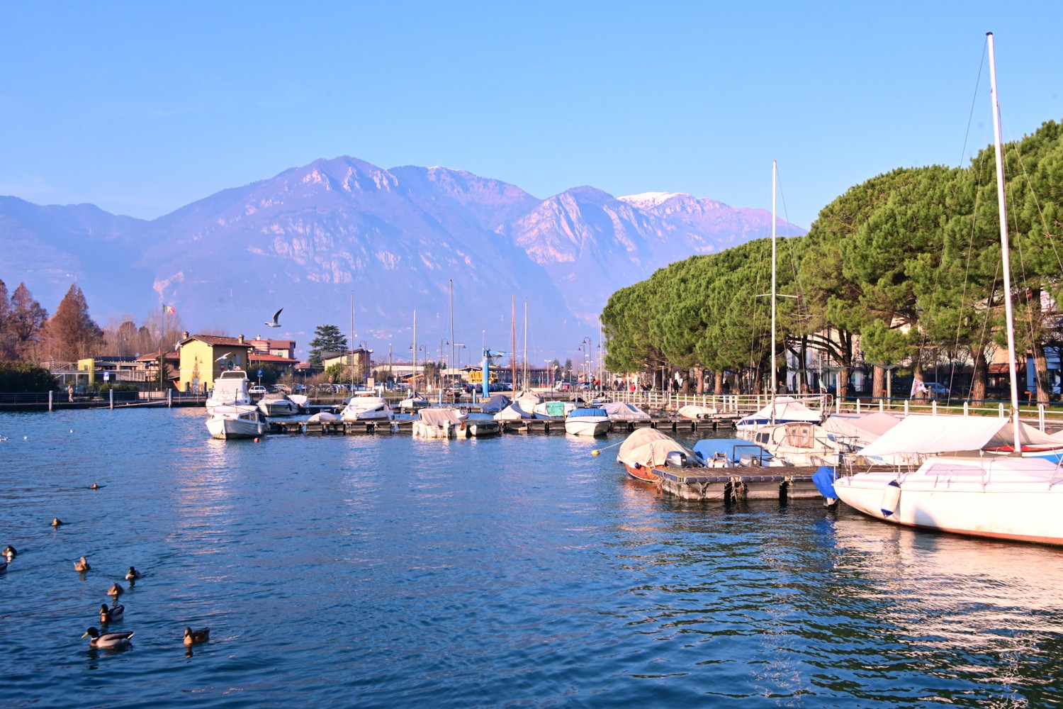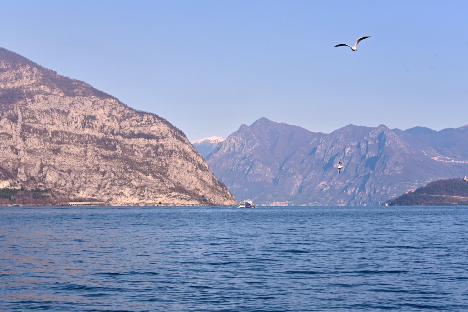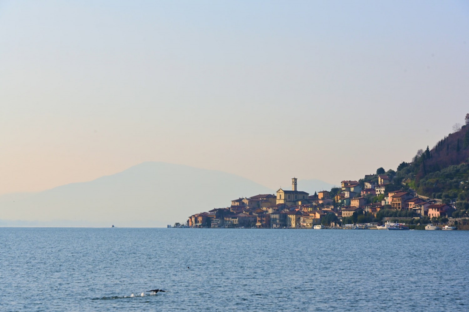 Von der Seepromenade aus gibt es einen faszinierenden Blick auf die Bergwelt rund um den See, die teils Schnee bedeckten Gipfel und die „Monte Isola“, die Insel im Iseosee, die dank Christos „Floating Piers“ 2016 über das Wasser gehend zu Fuß zu erreichen war. Wie das damals aussah, sehr ihr hier: