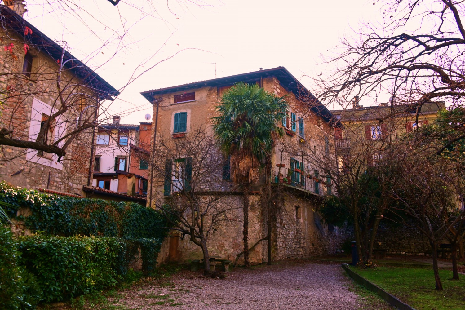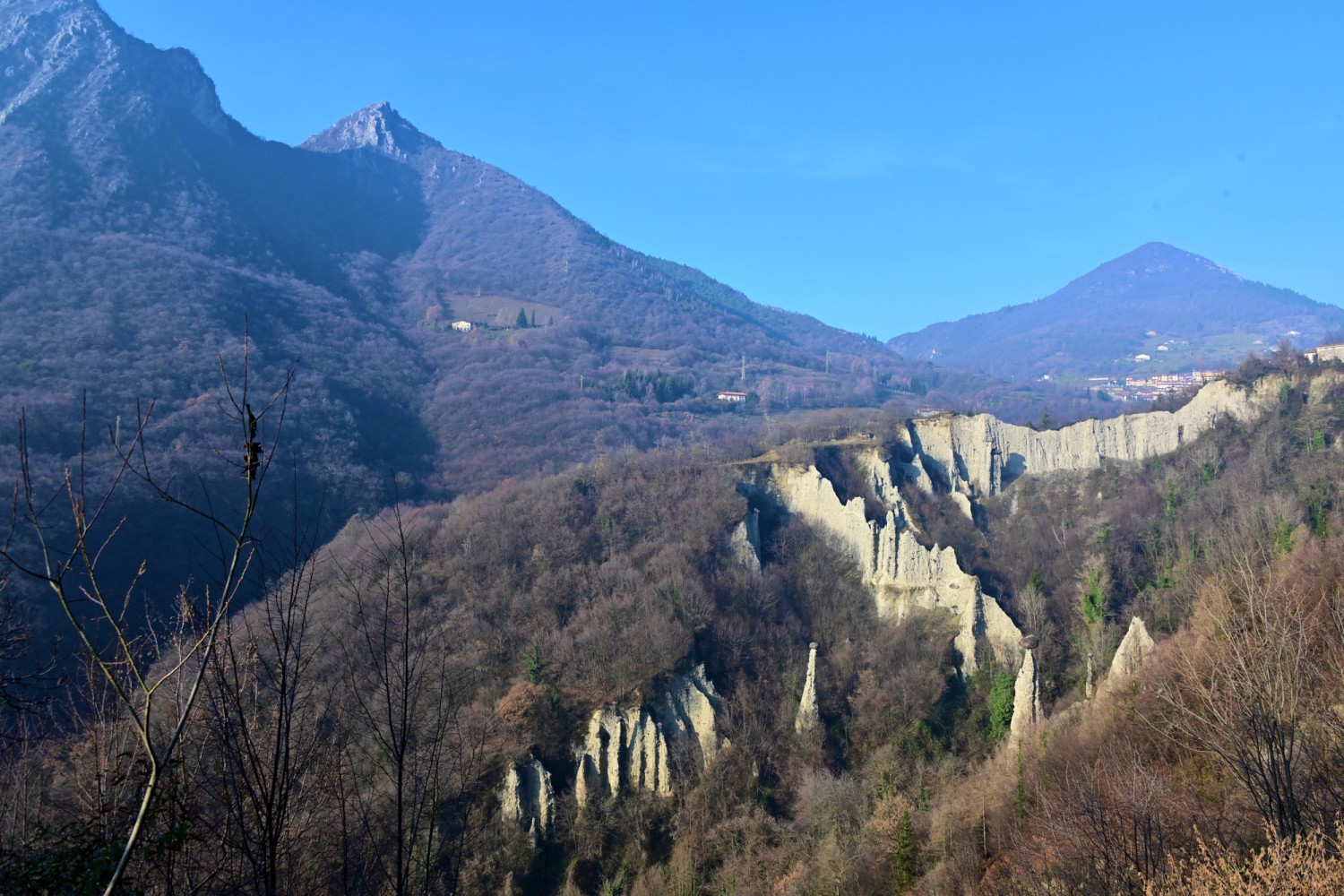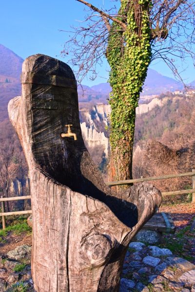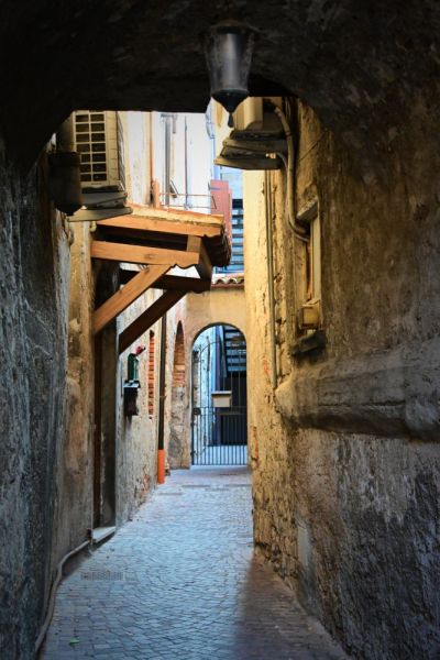 Oberhalb der kleinen Festung auf der Insel sieht man auch schon eines unserer nächsten Ziele, die Erosionspyramiden von „Zone“, die von Iseo aus in nördlicher Richtung im oberen Drittel des Sees in knapp 700 m Höhe zu finden sind. Durch die urigen Gassen der Altstadt von Iseo geht es gemütlich zurück zum Auto. Wir bemerken nun, das die Sicht immer schlechter wird und die Sonne wie durch einen Schleier scheint. Na mal sehen, was das heute noch mit unseren Rest-Vorhaben wird.