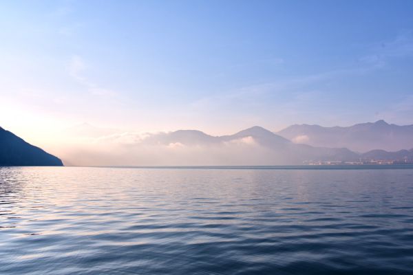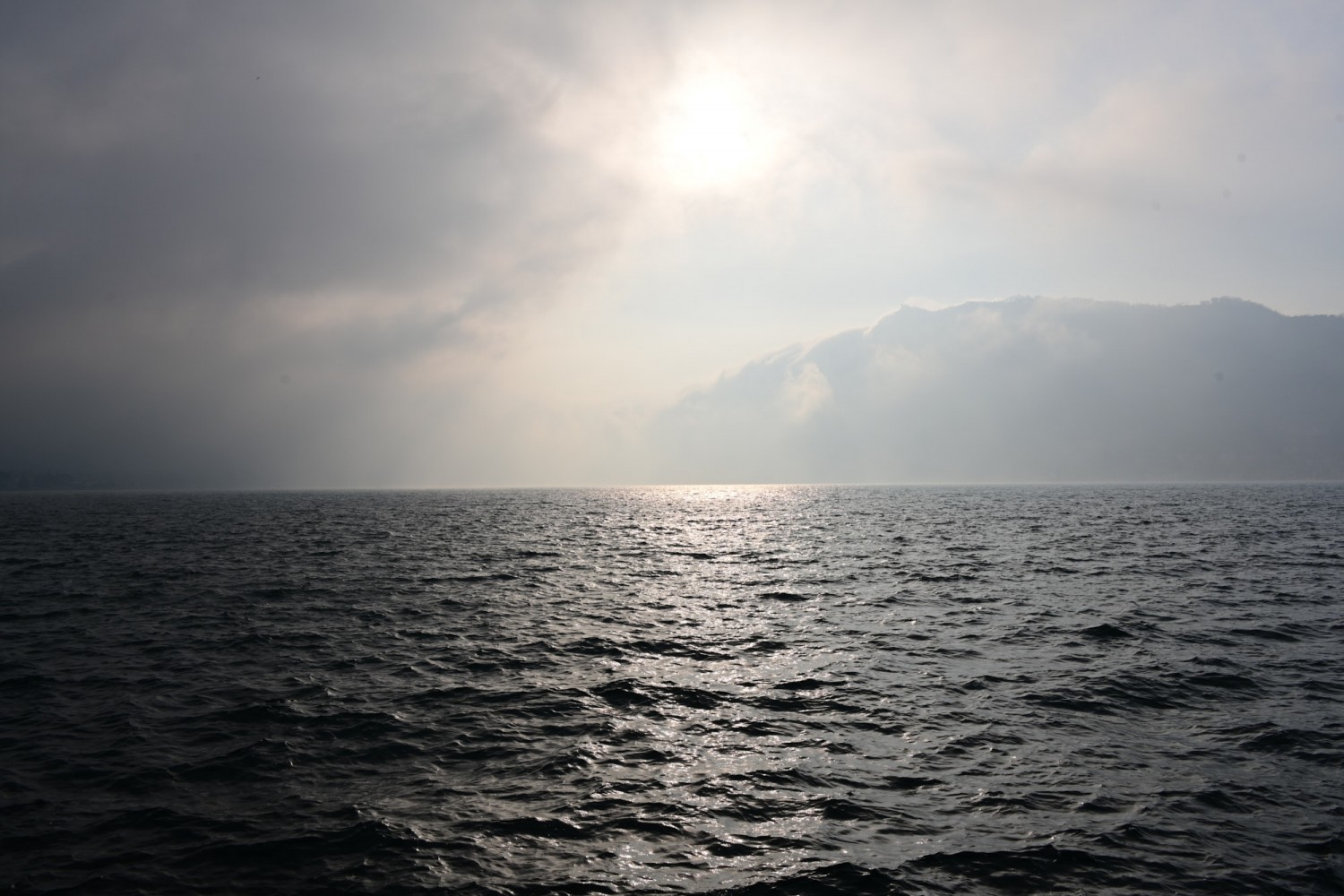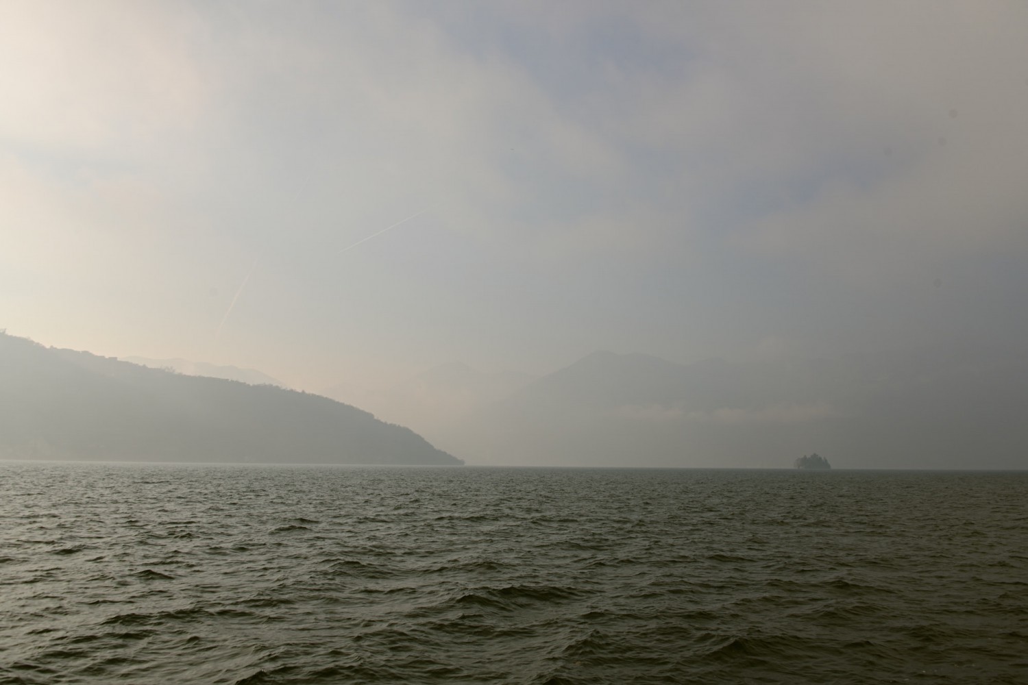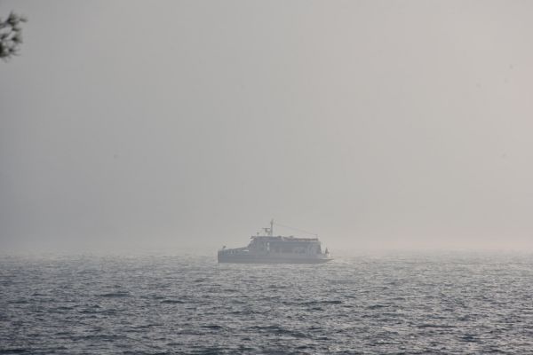 Während des Essens stellen wir schon fest, das der See nicht mehr spiegelglatt ist wie am Vormittag und die Sicht wird immer schlechter, fast können wir das gegenüber liegende Ufer nicht mehr sehen. Das ging aber schnell!