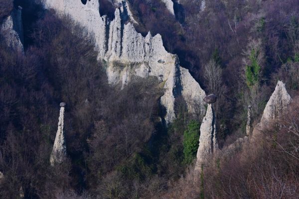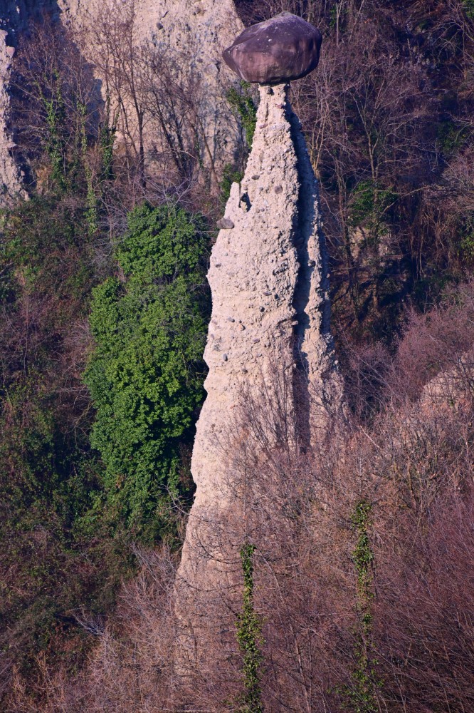 Wir wagen den Abstecher in die Berge trotzdem, je weiter höher wie gelangen, um so besser ist auch wieder die Sicht. So können wir den Blick auf die Pyramiden von „Zone“ doch noch erhaschen. Es gibt schon merkwürdige Sachen, die die Natur so hervor bringt. Diese Pyramiden gehören definitiv dazu. Sie entstehen aus leicht erodierbarem Gestein (Sandstein, Löss, vulkanischem Tuff …) und werden durch aufliegende Blöcke aus weniger gut erodierbarem Material vor der völligen Abtragung bewahrt. So viel dazu.
