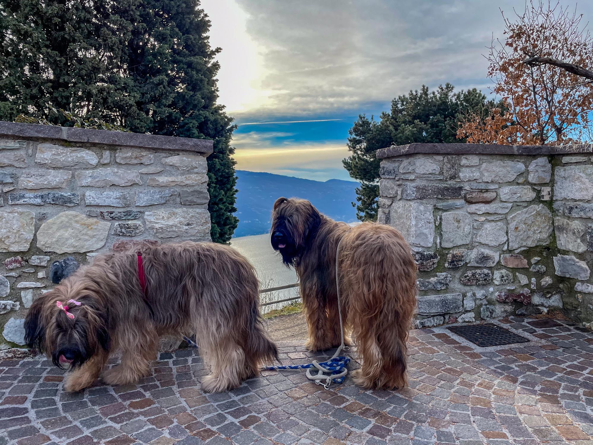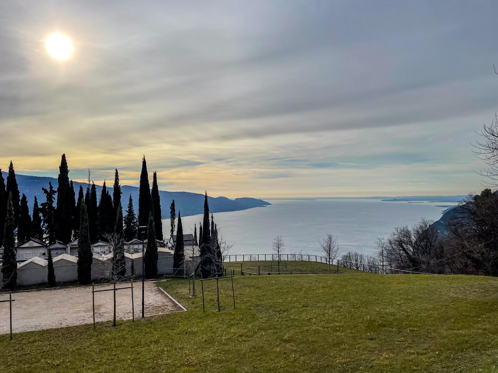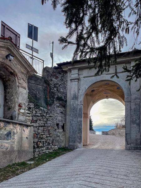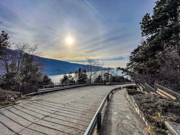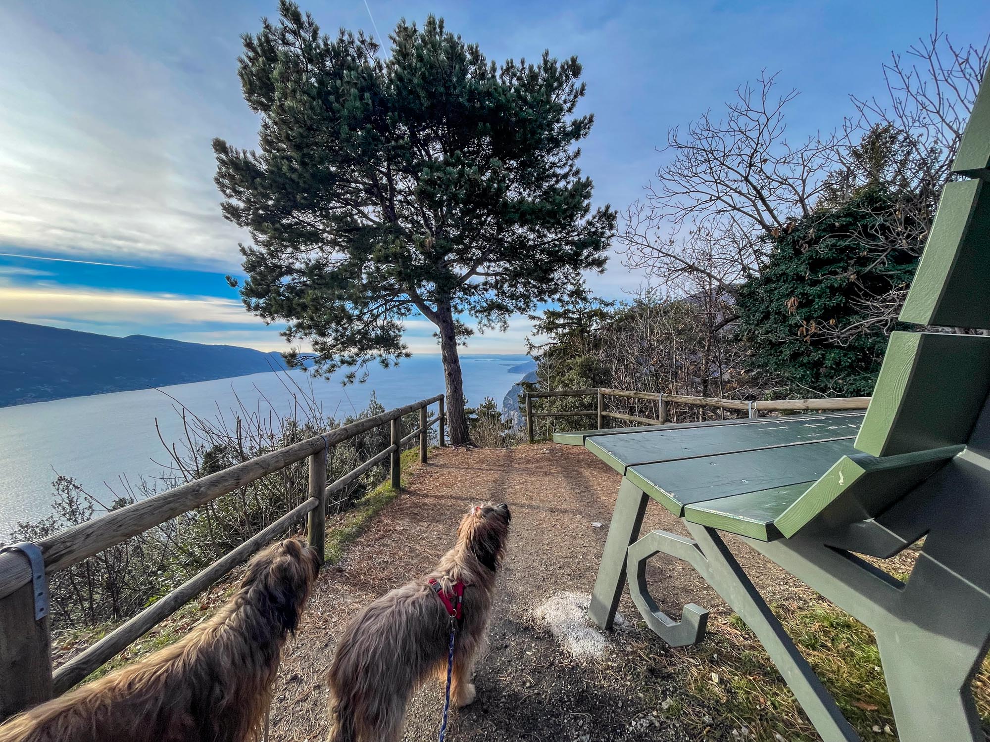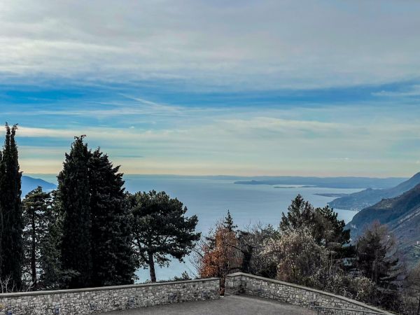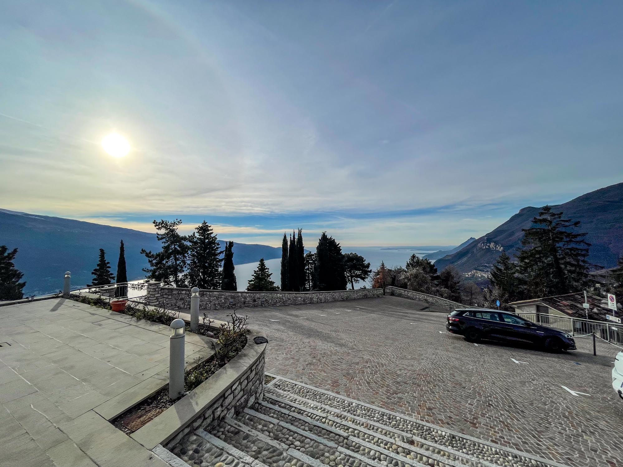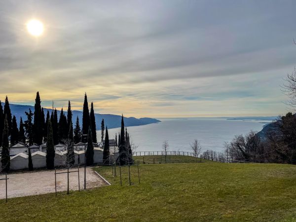 Während Hendrik noch die knapp 2.000 Notdienste auf die Webseite und den Screen einarbeitet, gibt es für Hunde und Frauchen eine große Hunderunde. Hinter unserem Haus geht es auf knapp 2 km rund 130 Meter bergauf zur »Geheiligte Stätte Santuario di Montecastello« mit der Katholische Kirche »Eremo di Montecastello«. Von hier aus hat man, wie schon auf Fotos im Silvester-Reiseblog von 2021 zu sehen ist, einen fantastischen Blick auf den Gardasee. Vom Süden und der Ostseite des Gardasees ist der steile Felsen mit der Kirche schon von weitem zu sehen.