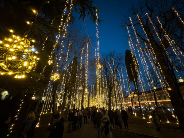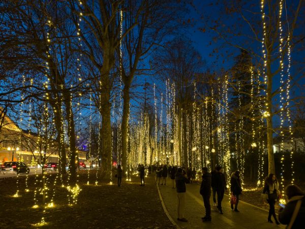 Über wenig Leute können wir uns hier nicht beklagen, wir kommen kaum vorwärts und stehen mehr als wir gehen. Aber alle sind entspannt und freundlich, es ist einfach eine bezaubernde Atmosphäre. Am schönsten empfinde ich die bis auf den Boden hängenden Lichterketten, deren Enden zusammengerollt von Weitem wie Glaskugeln aussehen. Sich da hindurch zu fitzen hat riesigen Spaß gemacht, Zwei- und Vierbeinern!