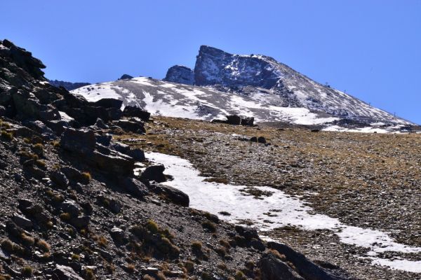 Wir brechen für Urlaubsverhältnisse relativ zeitig in Richtung Sierra Nevada auf (Bilder 1 – 3). Unser Ziel ist eine kleine Kapelle ca. 800m unterhalb des Gipfels des mit 3396m zweithöchstem Berges der Sierra Nevada, dem Veleta (Bild 4). Schon unterwegs fällt uns auf, es hat geschneit dort oben. Auf 2600m haben wir zwar um die 15°C, aber der Schnee hält sich wacker (Bild 5). Hendrik muss sich in der weissen Pracht erst einmal „austoben“ (Bild 6). Von dem Ergebnis war ich dann doch ziemlich angetan…