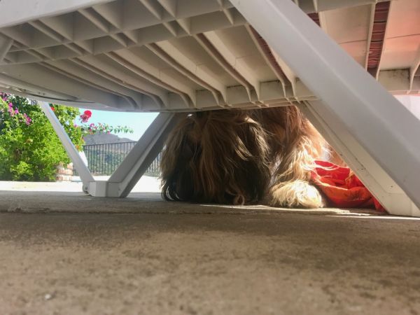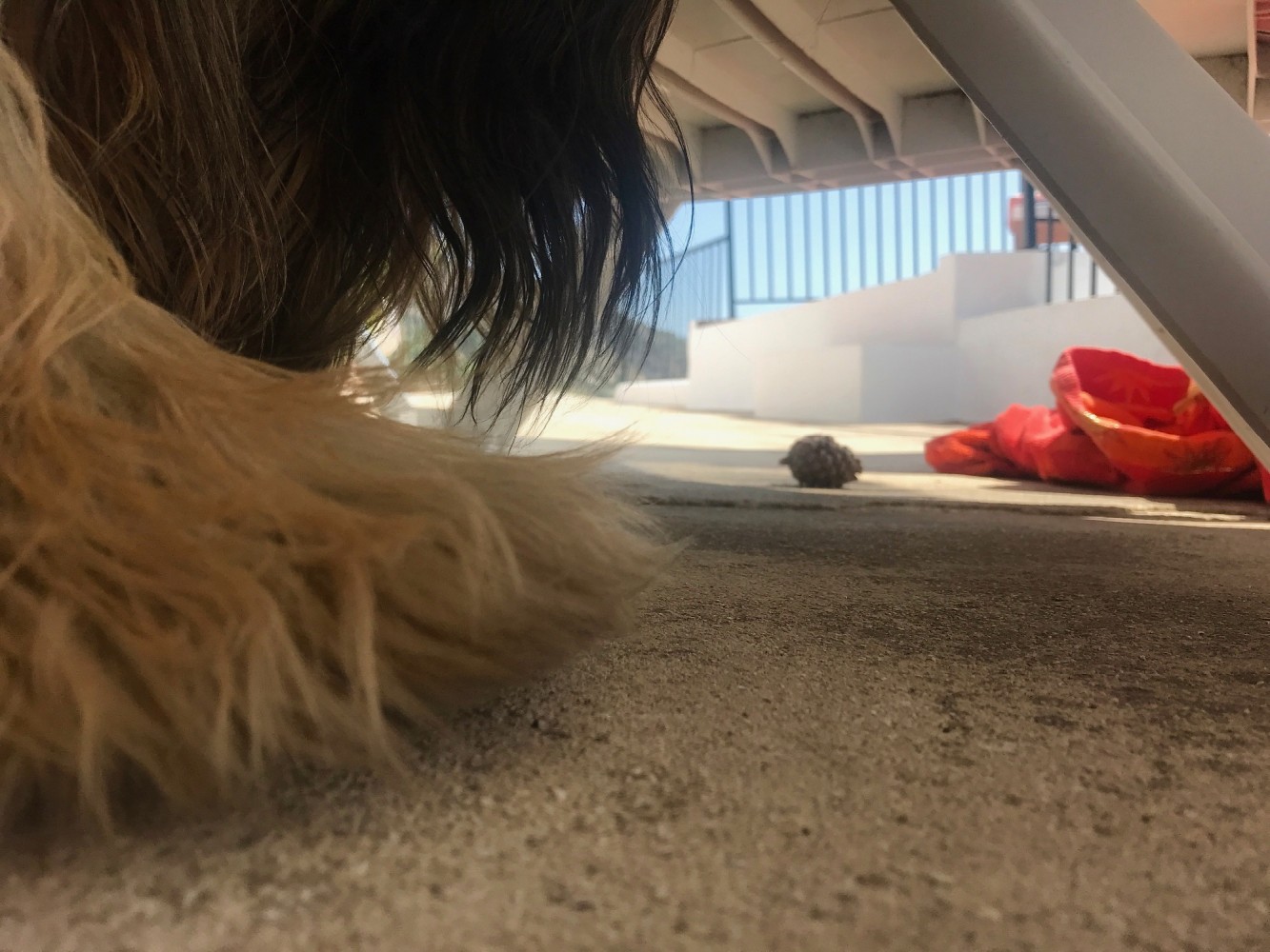 Der Tag startet so lala. Die Zweibeiner diskutieren noch darüber, was heute stattfinden soll und ich mache mir derweil so meine Gedanken: Wie komme ich nur an den blöden Zapfen, der da außerhalb meiner Reichweite so halb unter der Liege liegt?! Unter der Liege durchkrabbeln? Um die Liege herumschleichen und aus dem Hinterhalt zu schlagen? Die Liege ... Es geht los!