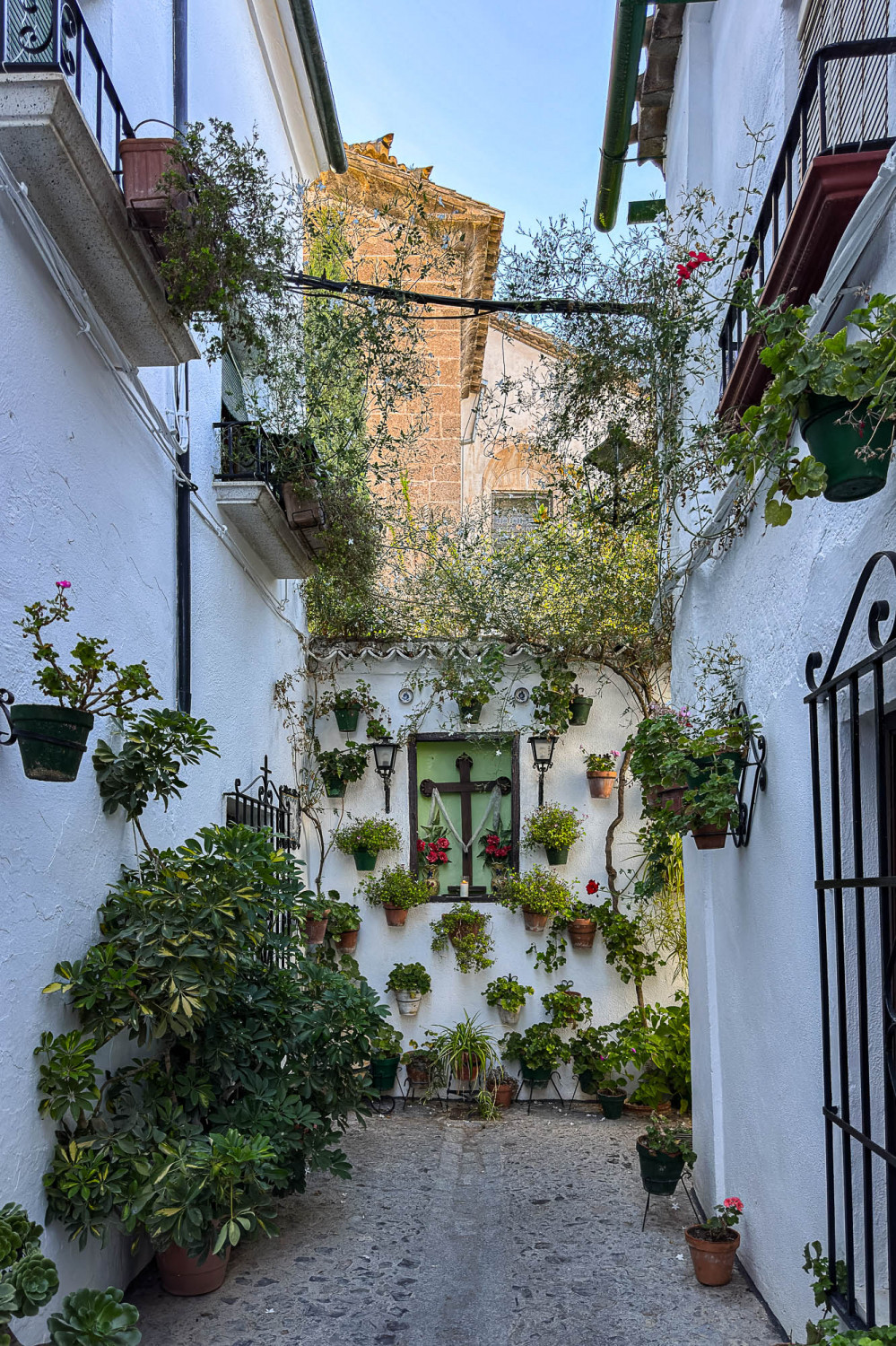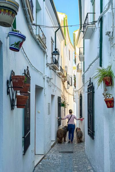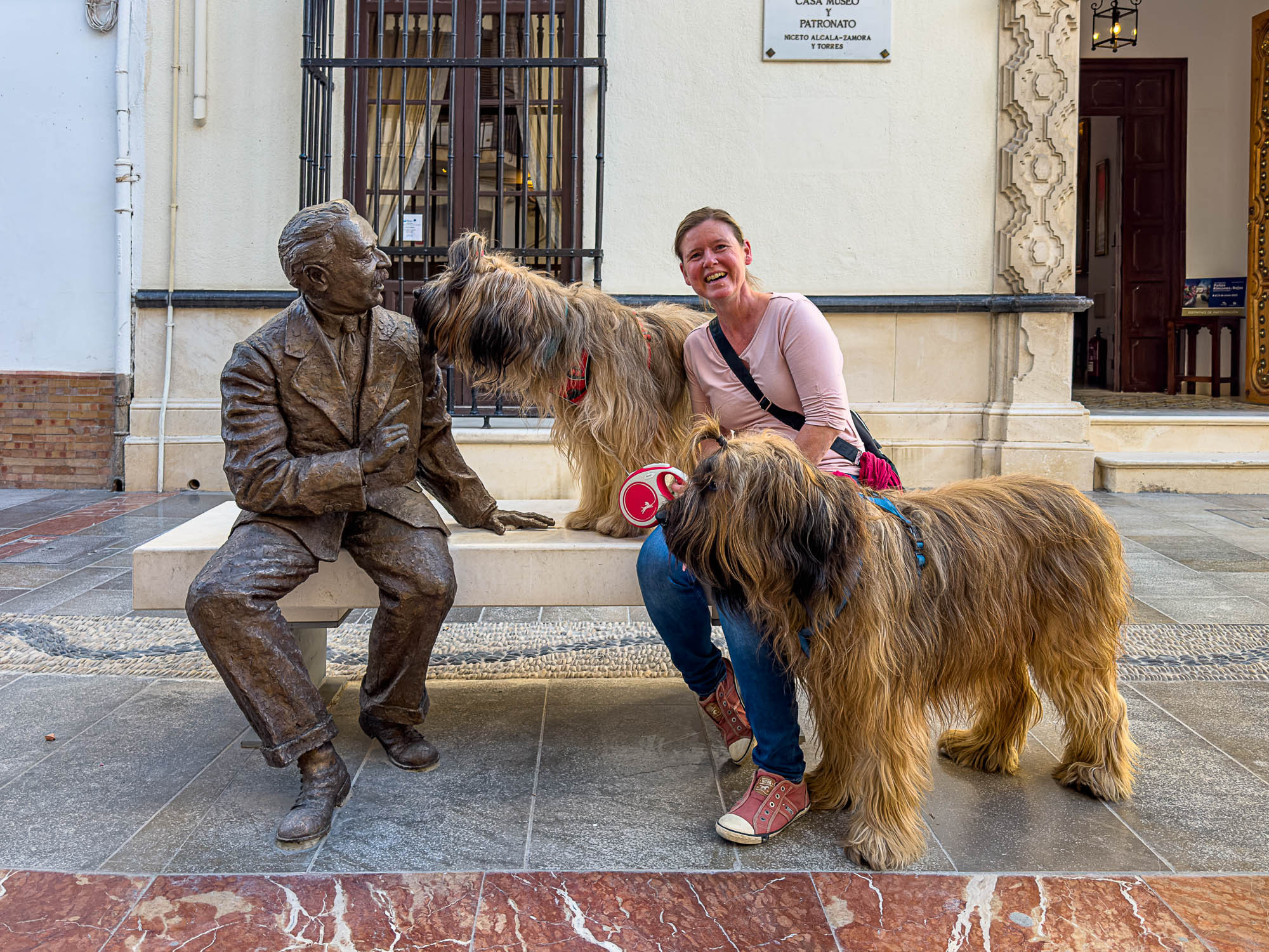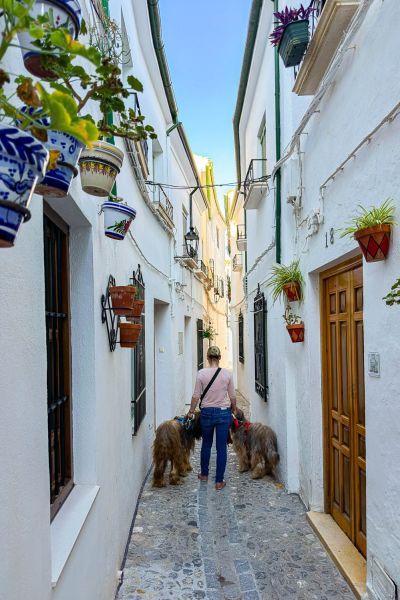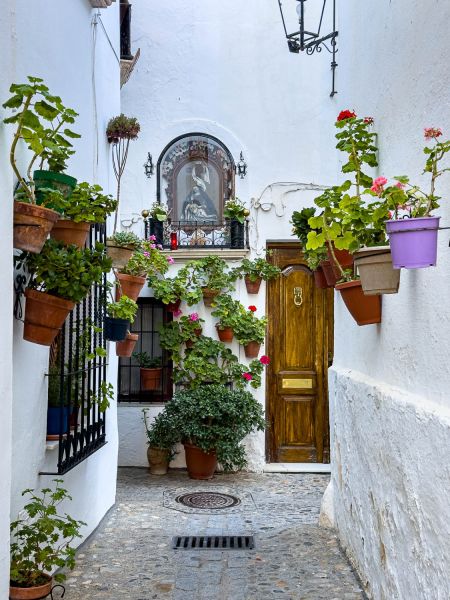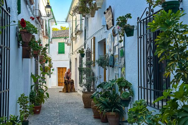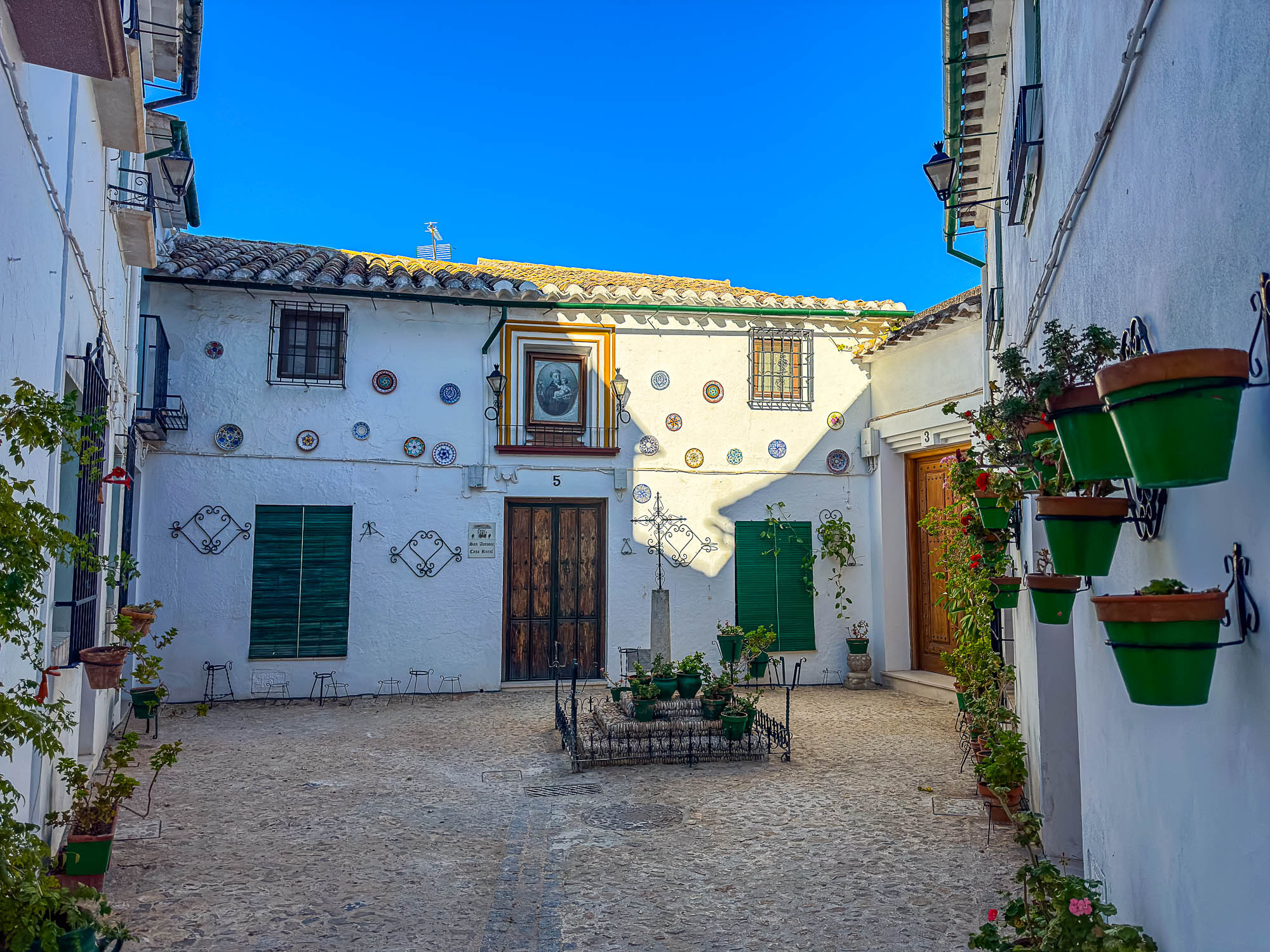 Wir bummeln durch stellenweise belebte Straßen, an der Stadtburg „Castillo de Priego de Cordoba“ entlang, einem militärischem Zweckbau von strengem Erscheinungsbild. Das Castillo steht seit 1943 unter Denkmalschutz und war leider nicht von innen zu erkunden, weil geschlossen. Nach der kleinen Kirche biegen wir schon in des „Barrio de la Villa“ ein. Die Fotos dieses Stadtviertels im Internet und auf Empfehlung des ADAC-Reiseführers haben uns überhaupt erst auf die Idee gebracht, hierher zu fahren. Dieses schicke Kleinod wollten wir unbedingt selbst anschauen. Und das tun wir jetzt und wir kommen aus dem Staunen nicht heraus. Die Architektur mit den weißen zwei- bis dreistöckigen Häusern und den langen engen Gassen ist so typisch für Andalusien. Bemerkenswert und gleichzeitig faszinierend und einfach nur wunderschön ist der überbordernde Blumenschmuck, der von fast allen Balkonen und aus allen Gitterfenstern herausquillt. Alles wirkt mit ganz viel Liebe gepflanzt und wird das ganze Jahr super gepflegt. Die Gassen sind stellenweise so eng, dass ich mit den beiden Hunden an meiner Seite kaum hindurch passe. Also dick sein darf man hier wirklich nicht, nein, nein …