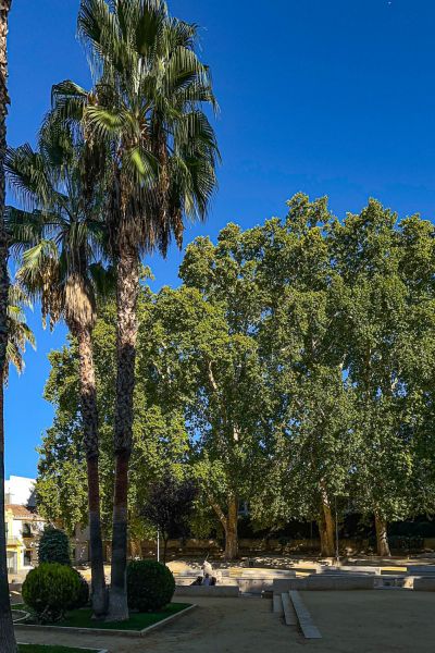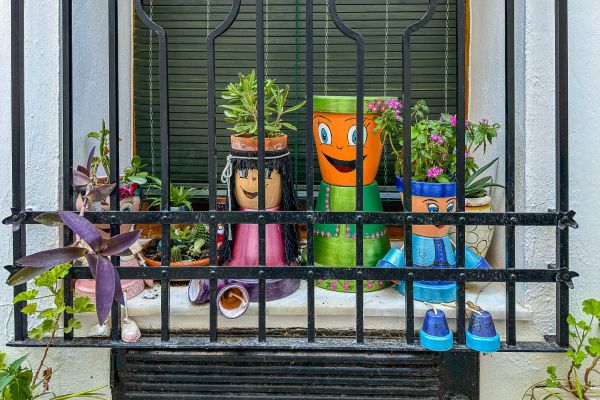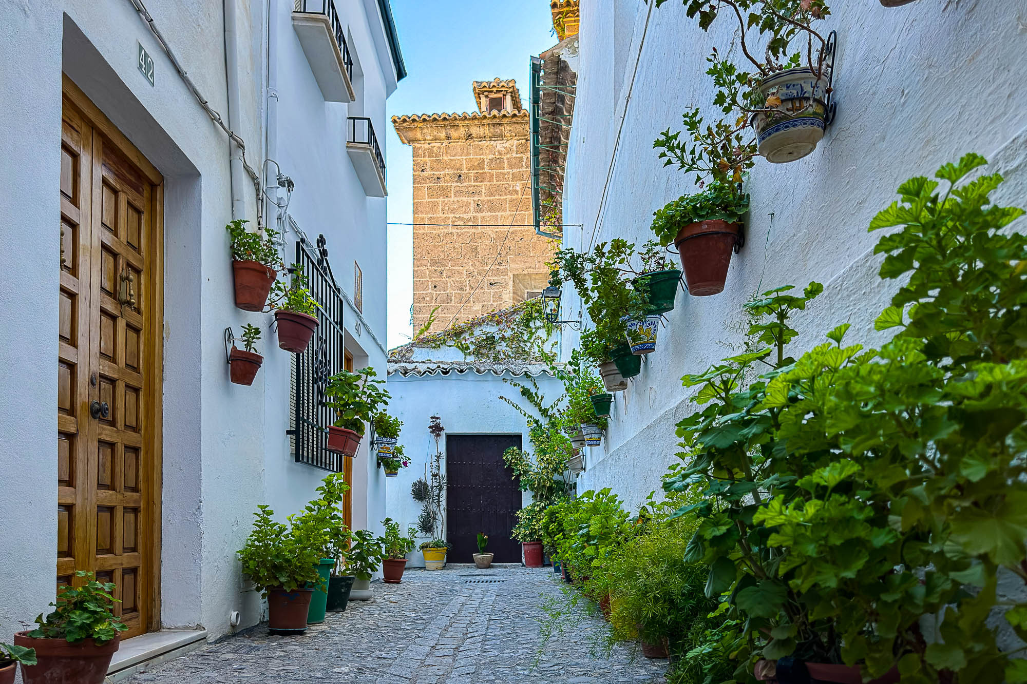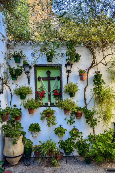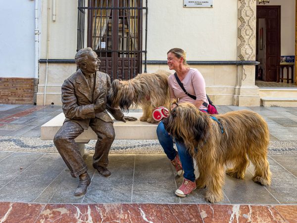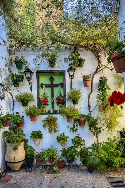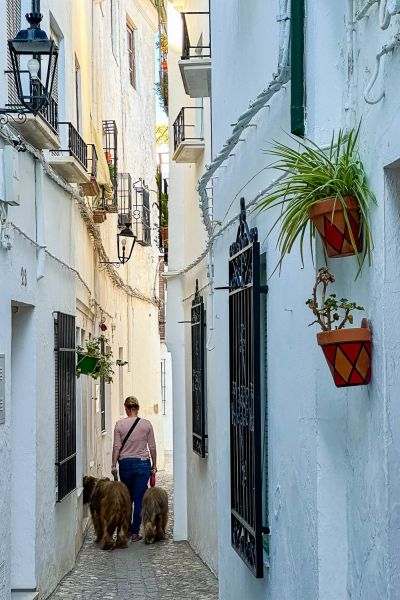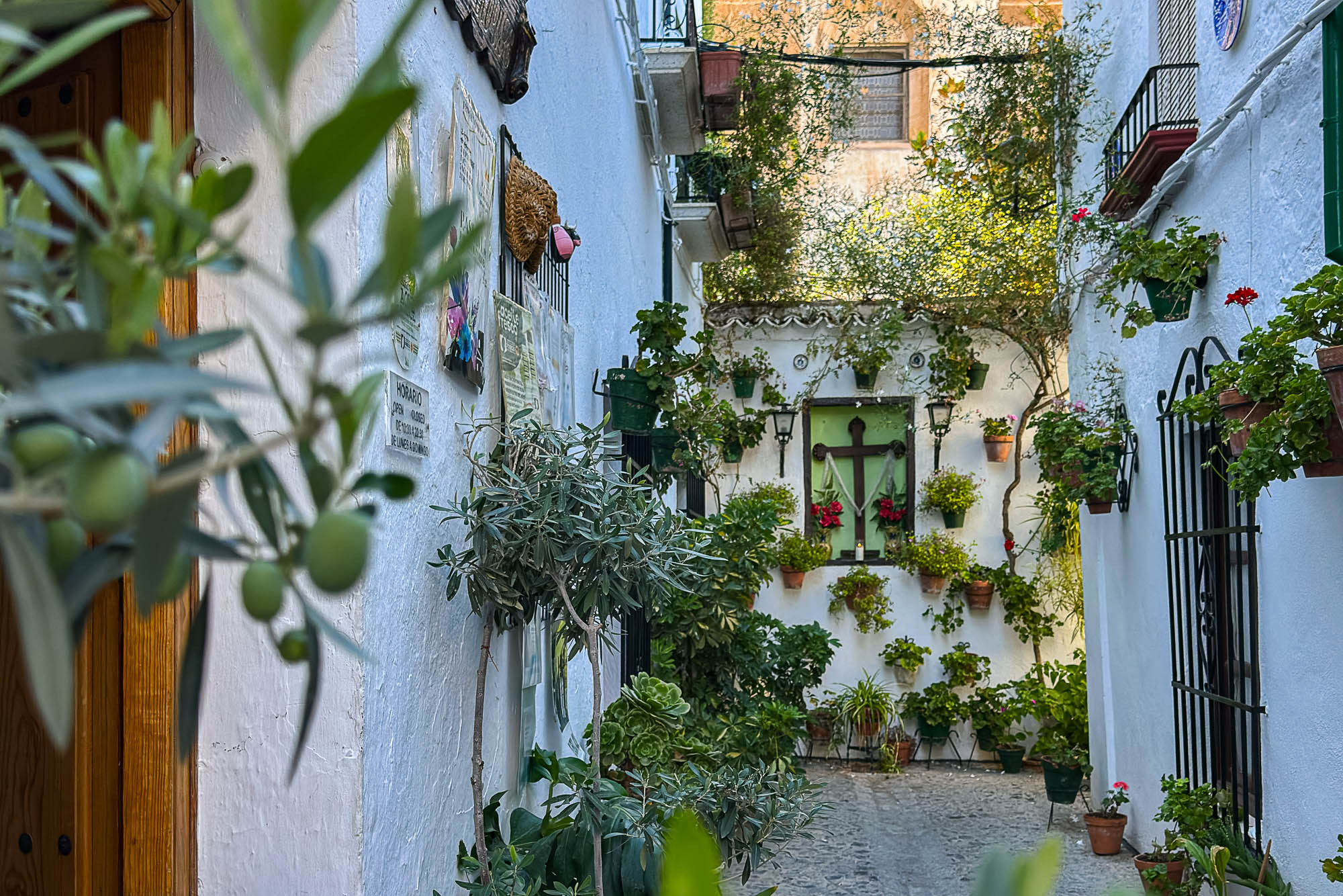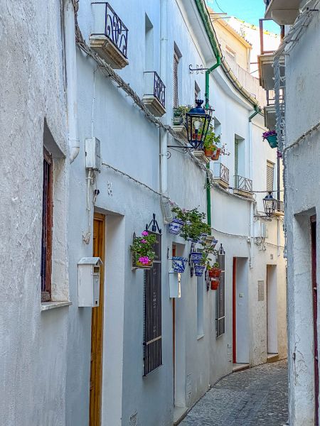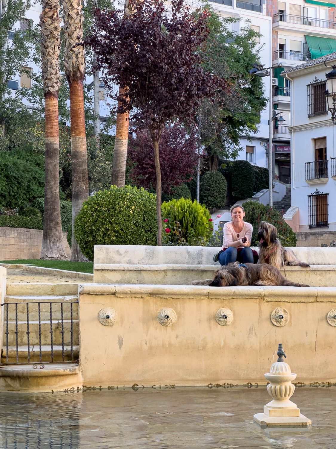 Wir bummeln durch stellenweise belebte Straßen, an der Stadtburg „Castillo de Priego de Cordoba“ entlang, einem militärischem Zweckbau von strengem Erscheinungsbild. Das Castillo steht seit 1943 unter Denkmalschutz und war leider nicht von innen zu erkunden, weil geschlossen. Nach der kleinen Kirche biegen wir schon in des „Barrio de la Villa“ ein. Die Fotos dieses Stadtviertels im Internet und auf Empfehlung des ADAC-Reiseführers haben uns überhaupt erst auf die Idee gebracht, hierher zu fahren. Dieses schicke Kleinod wollten wir unbedingt selbst anschauen. Und das tun wir jetzt und wir kommen aus dem Staunen nicht heraus. Die Architektur mit den weißen zwei- bis dreistöckigen Häusern und den langen engen Gassen ist so typisch für Andalusien. Bemerkenswert und gleichzeitig faszinierend und einfach nur wunderschön ist der überbordernde Blumenschmuck, der von fast allen Balkonen und aus allen Gitterfenstern herausquillt. Alles wirkt mit ganz viel Liebe gepflanzt und wird das ganze Jahr super gepflegt. Die Gassen sind stellenweise so eng, dass ich mit den beiden Hunden an meiner Seite kaum hindurch passe. Also dick sein darf man hier wirklich nicht, nein, nein …