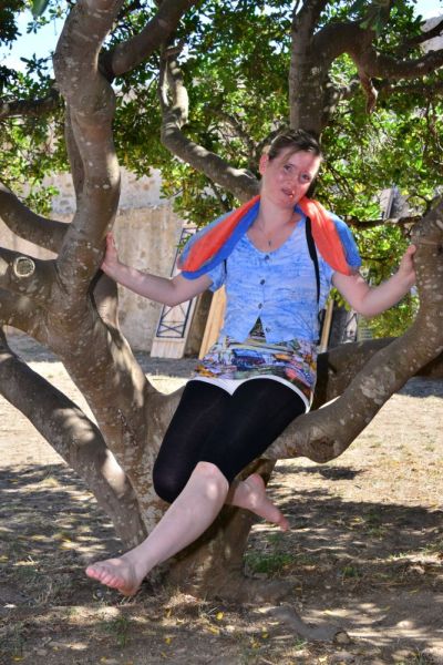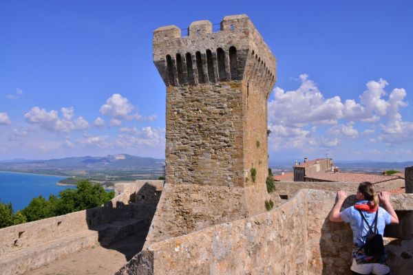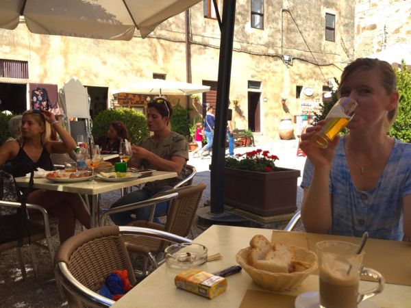 Doch es geht gleich wieder bergauf (Foto 16). „Populonia“ mit seiner Etrusker-Festung in 200 m Höhe (Fotos 17 – 19) ist unser nächstes Ziel. Vom Turm aus genießen wir den tollen Blick auf das Meer und die Hügel der Toskana (Fotos 20 – 23). Der Auf- bzw. Abstieg im Turm ist ganz schön eng (Foto 24). Hendrik hat ganz schön Mühe, sich mit seiner Fotoausrüstung durch den Durchgang zu zwängen. Dafür sitzt es sich auf dem Olivenbaum dann um so bequemer (Foto 25). Im Festungshof herrscht mittelalterliches Treiben. Vergnügt schauen wir uns das ungewöhnliche Schauspiel eine Zeit lang an (Fotos 26 – 28) und schlendern dann langsam zurück. An den wunderschönen Malereien kommen wir kaum vorbei (Foto 29). Doch uns knurrt der Magen und so gibt es vor Ort gleich noch ein leckeres Essen - und wie es sich gehört, für Hendrik dazu einen Kaffee und für mich ein kühles Bier (Foto 30) ;-). Von Pasta mit Steinpilzen, Prädikat „Oberlecker“, gestärkt, geht es weiter.