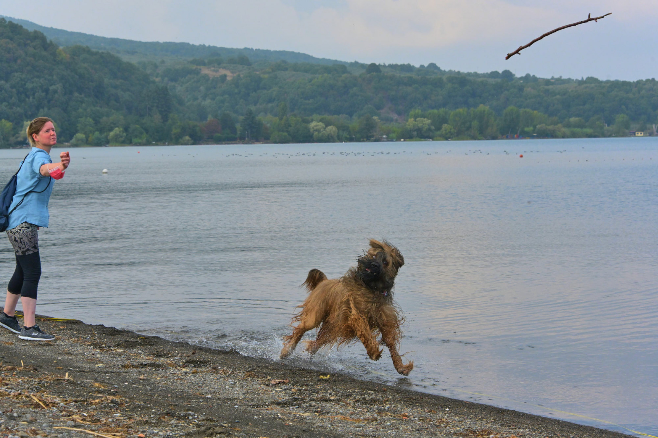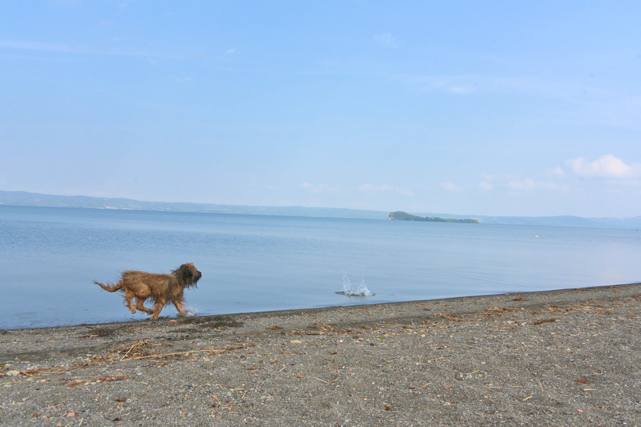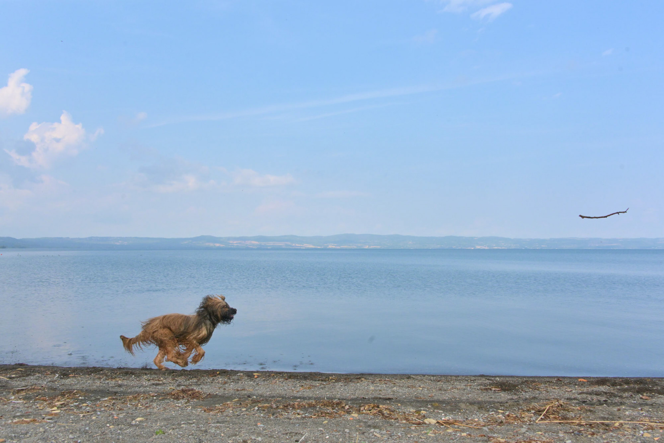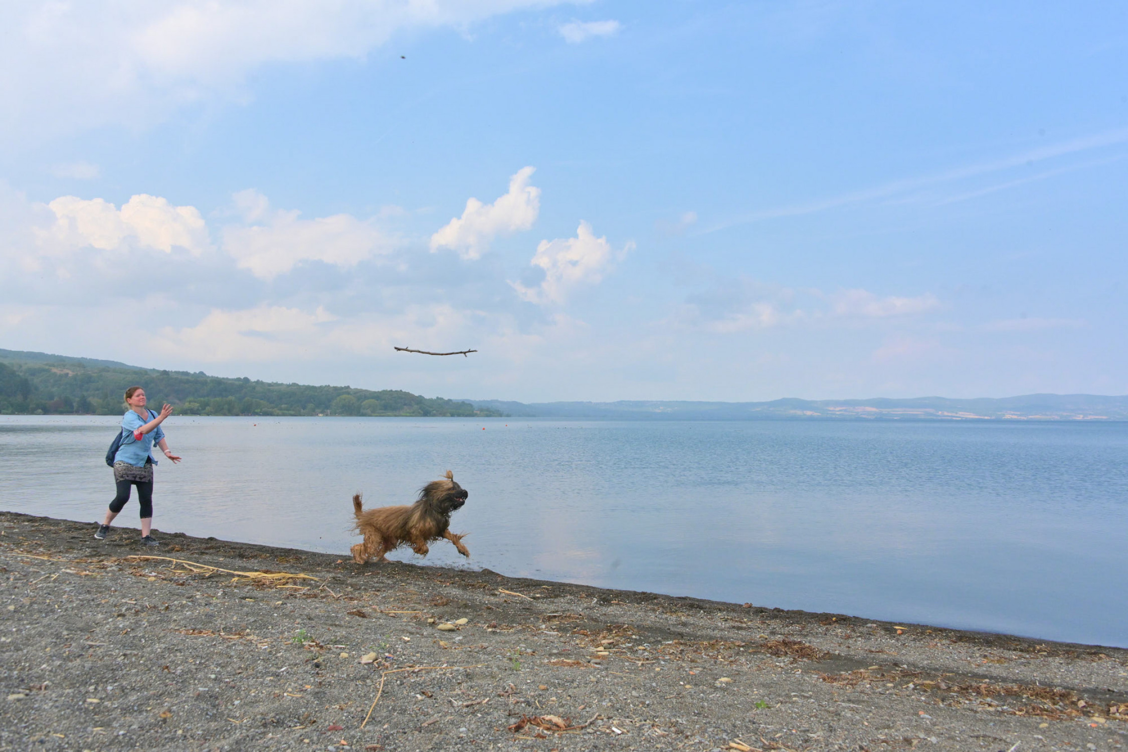 Nun müssen wir 20% Gefälle überwinden, um auf die Strandstraße und an den Strand von Capodimonte, den „Spiagga di Cavajano“ zu gelangen. Hier darf sich Archibald nach Herzenslust im See austoben, hmmm, sofern er will … Mit Hilfe des Stöckchens hat er die Vorsicht etwas überwunden und sich doch noch in die Fluten geschmissen. Herrliche Fotos!!!!!