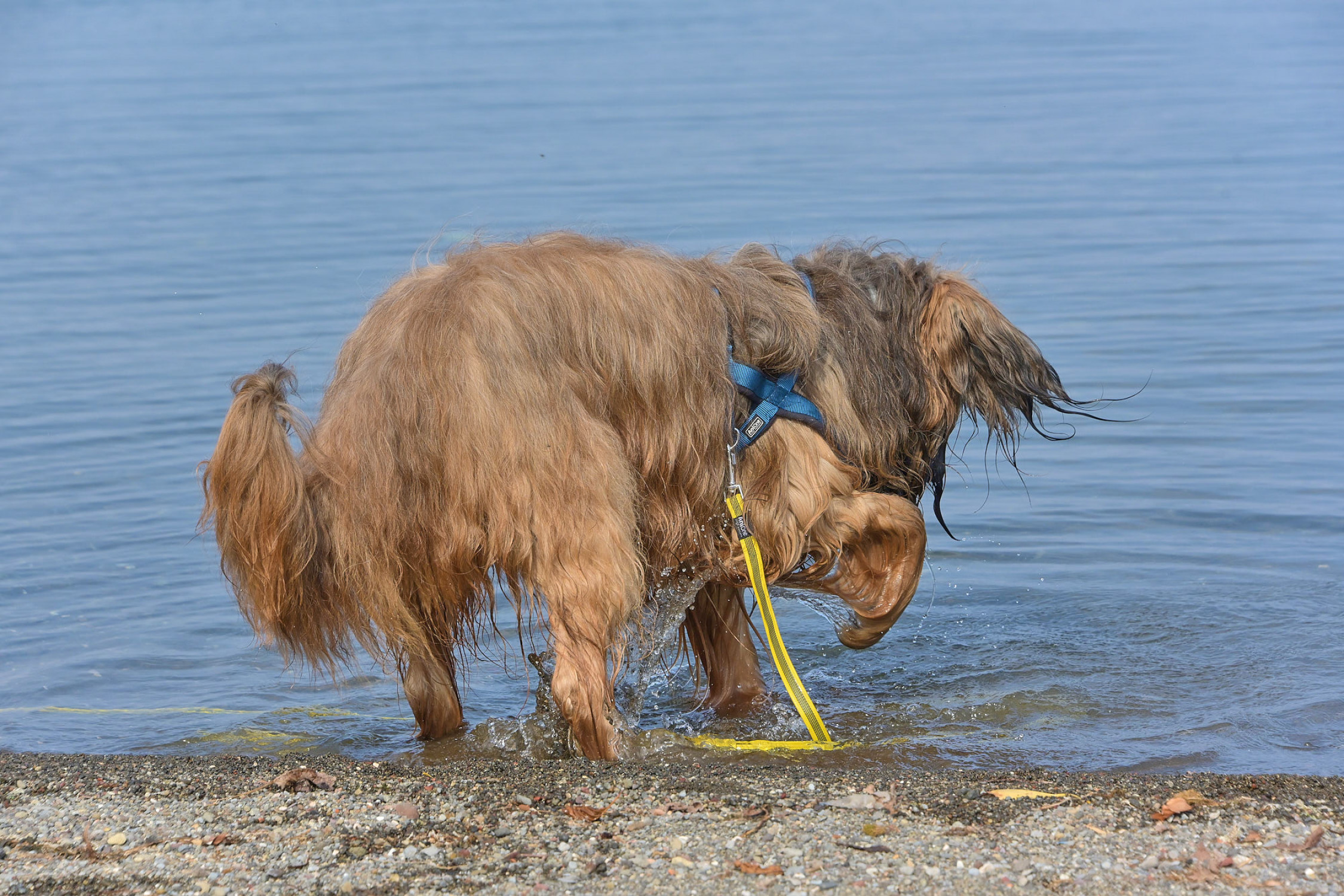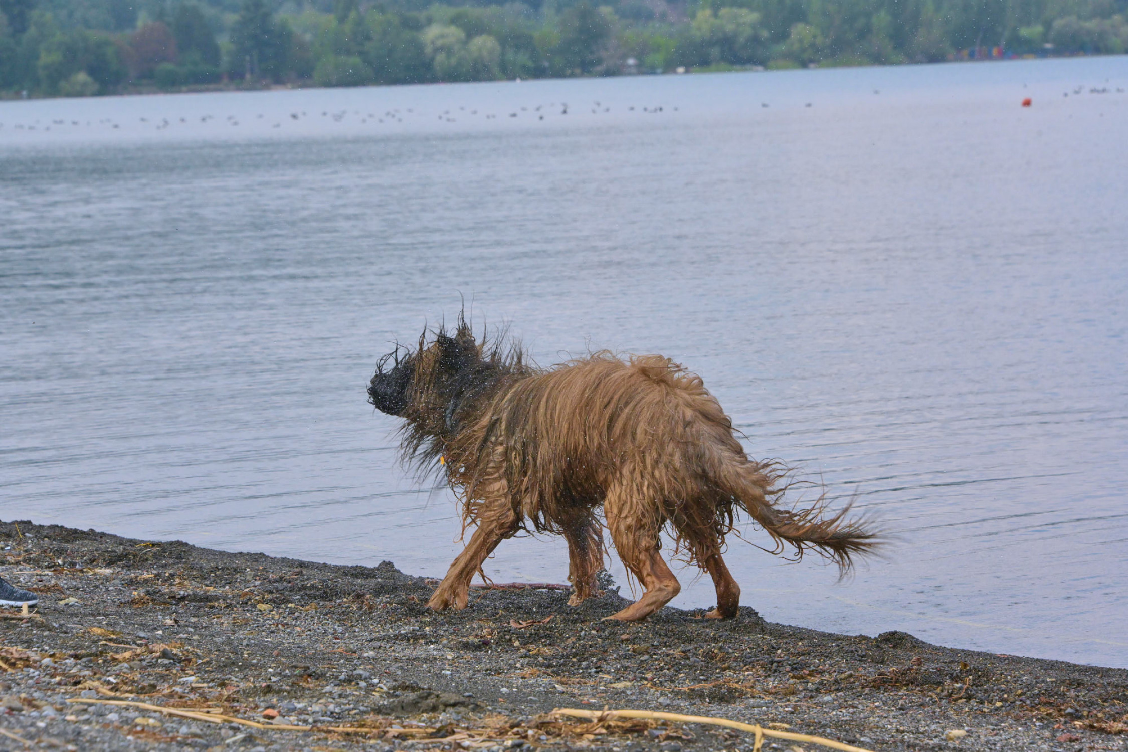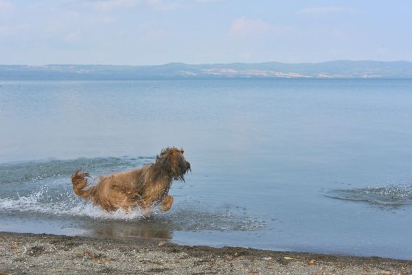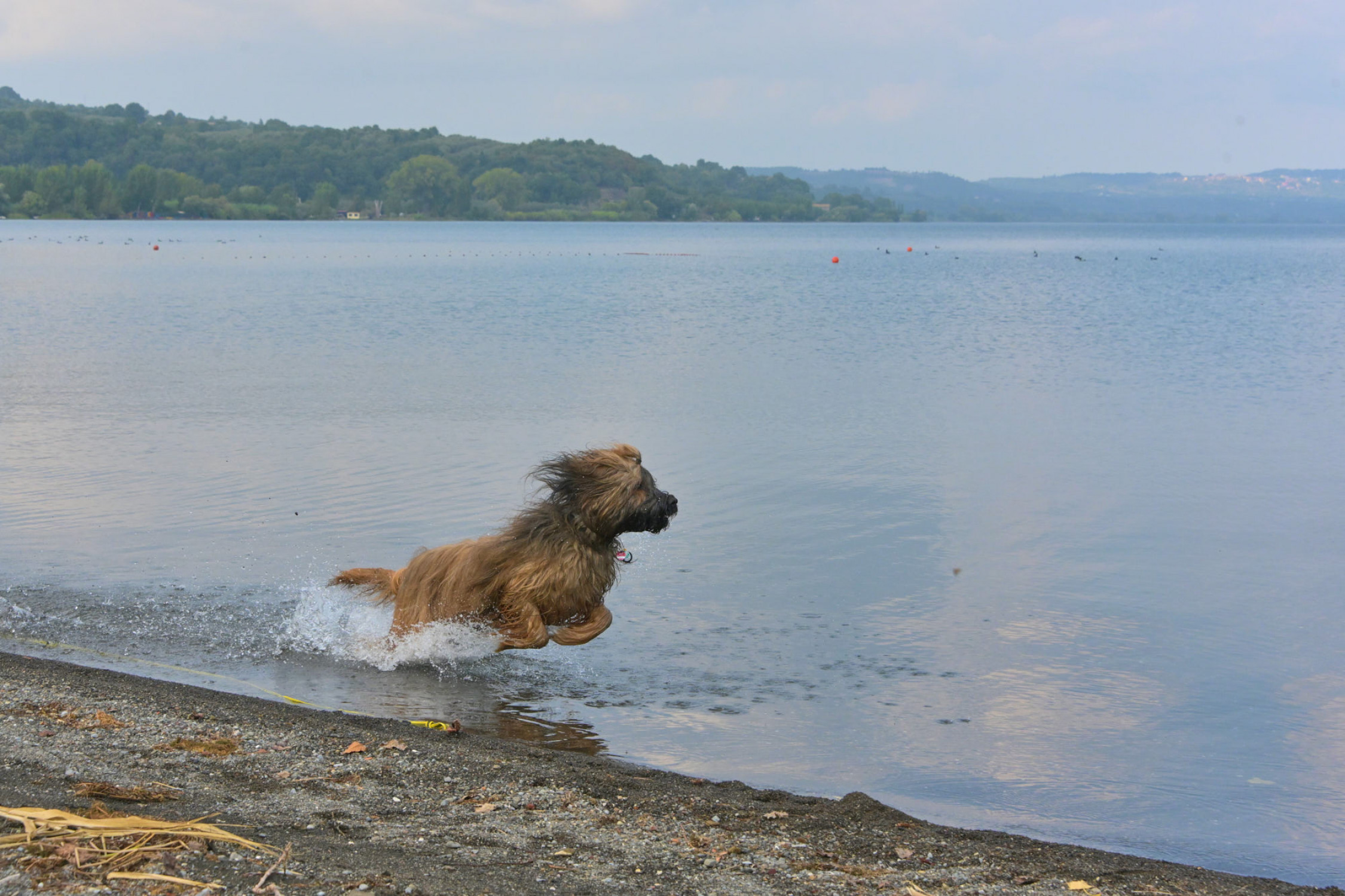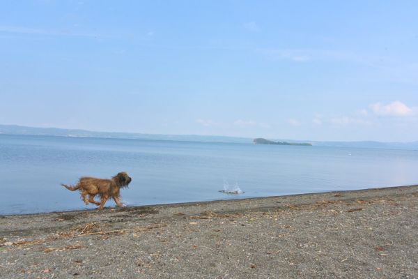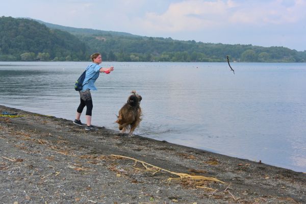 Nun müssen wir 20% Gefälle überwinden, um auf die Strandstraße und an den Strand von Capodimonte, den „Spiagga di Cavajano“ zu gelangen. Hier darf sich Archibald nach Herzenslust im See austoben, hmmm, sofern er will … Mit Hilfe des Stöckchens hat er die Vorsicht etwas überwunden und sich doch noch in die Fluten geschmissen. Herrliche Fotos!!!!!