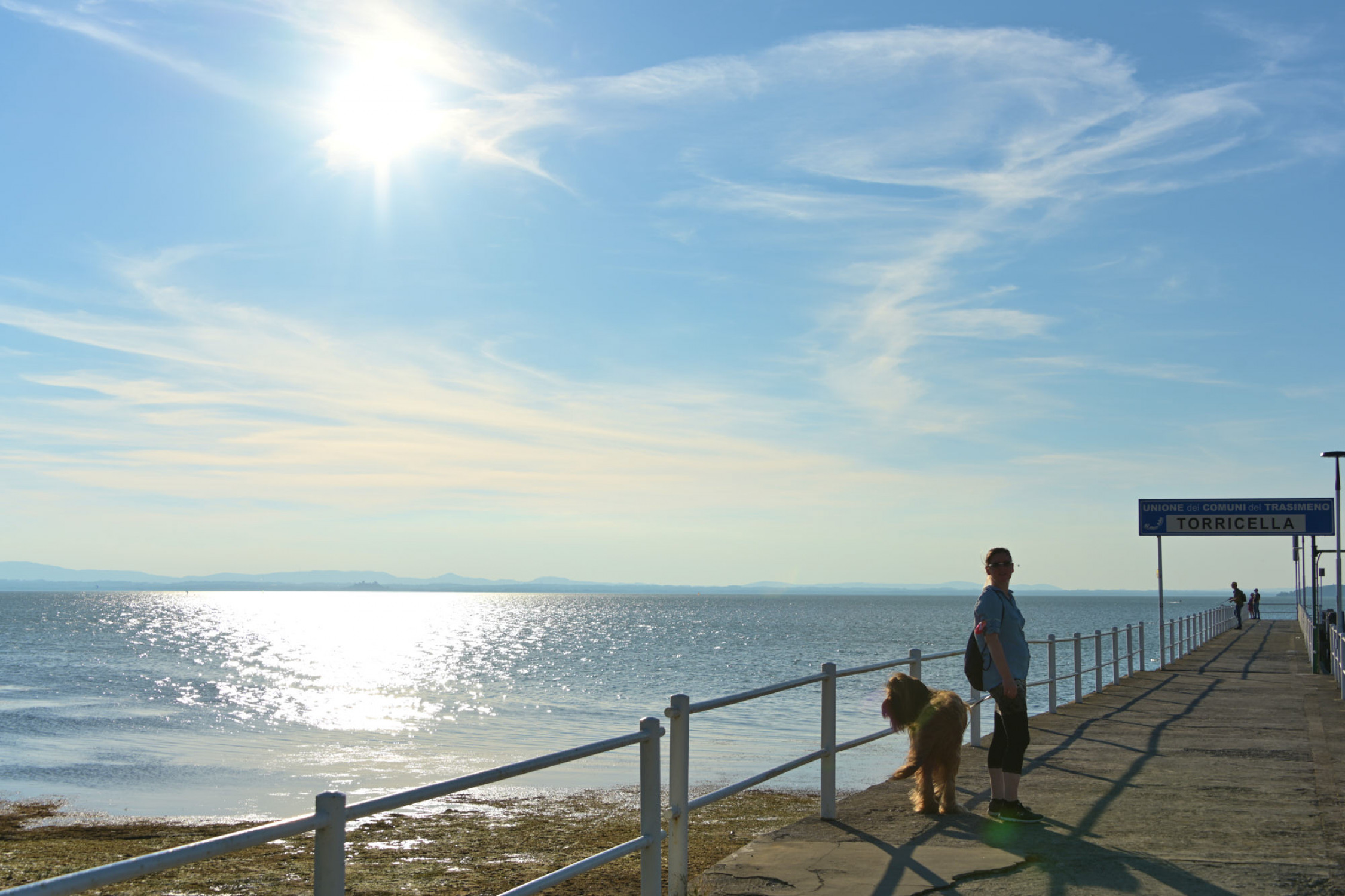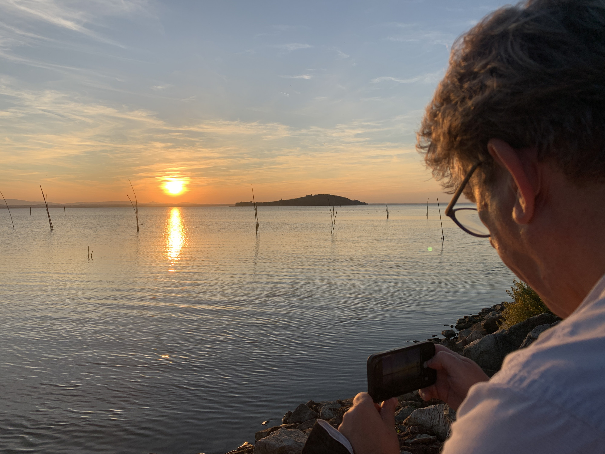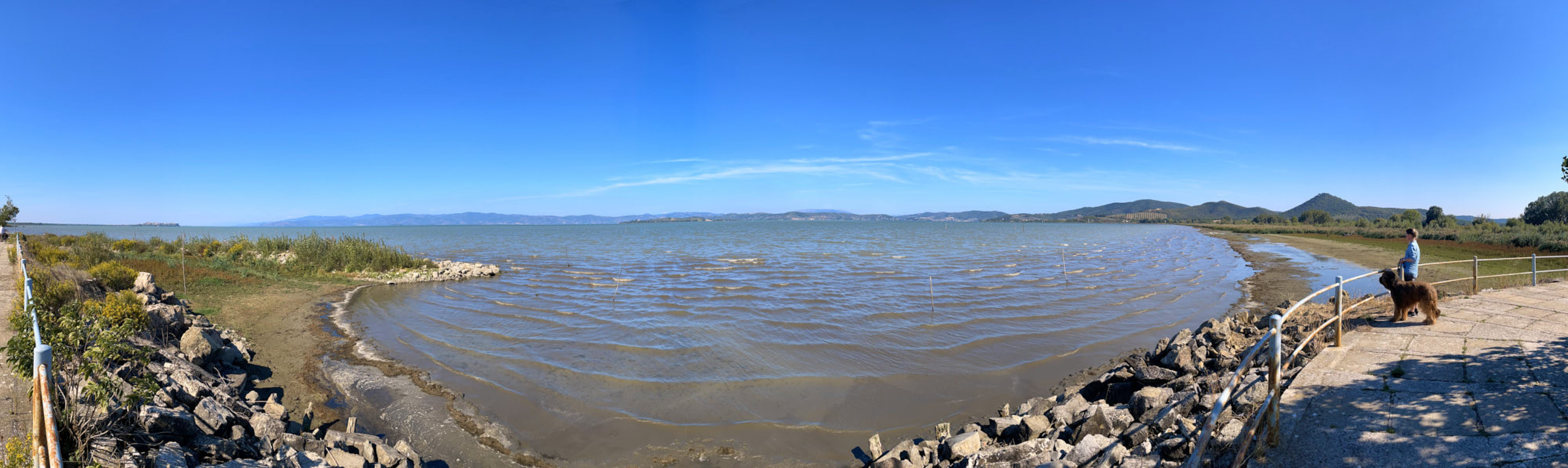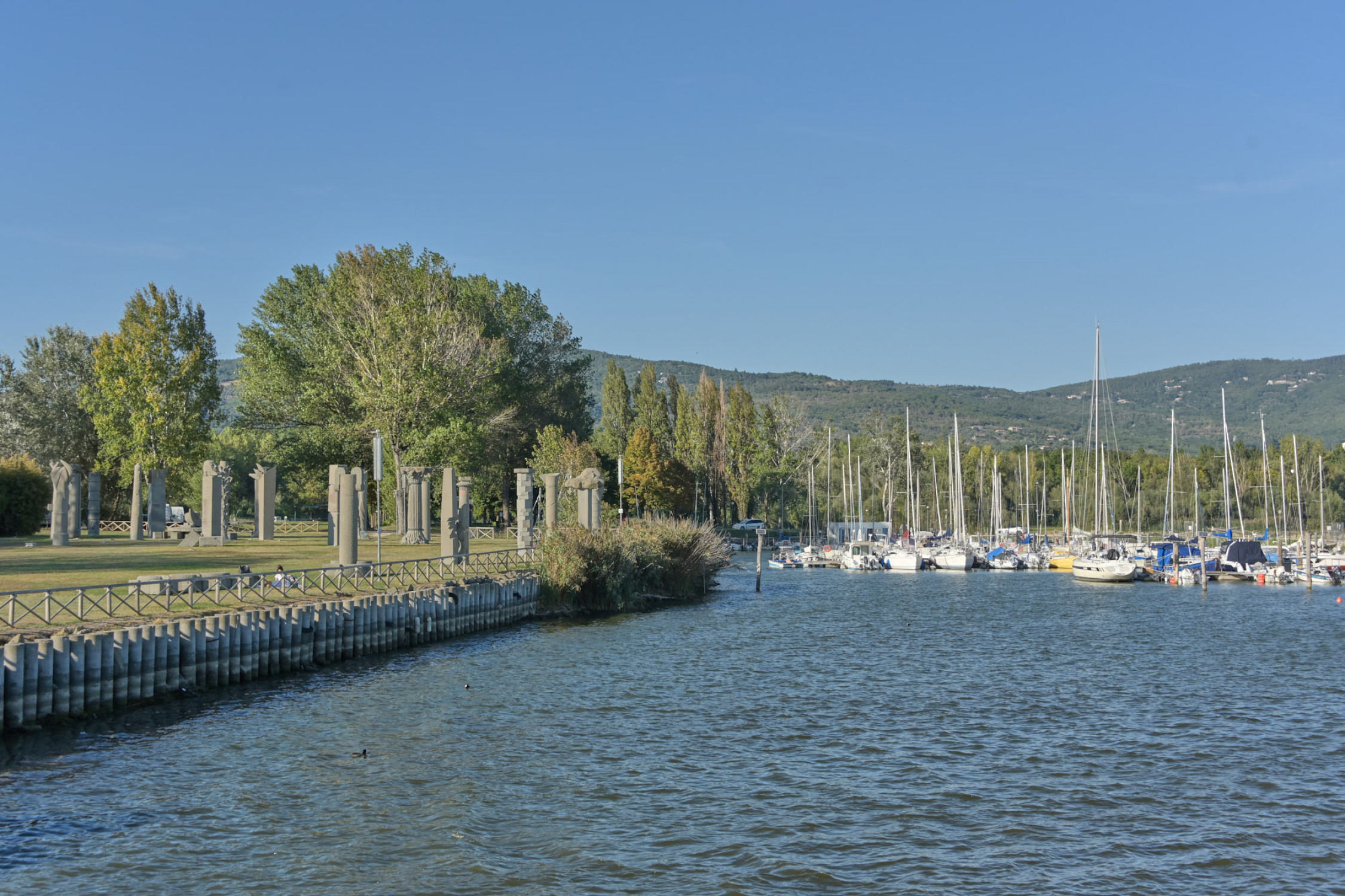 Nächster Halt „Spiaggia di Tuoro sul Trasimeno“ im Norden des Sees (2C) . Hier am Strand schlürfen wir gemütlich einen Kaffee und schauen den ganzen zwei vorhandenen Badegästen zu. Vom Anleger startet hier die Fähre zur „Isola Maggiore“. Den Skulpturenpark „Campo del Sole“ besuchen wir leider nicht, denn wir merken wieder einmal, wie die Zeit rennt und wir haben noch ein paar Stationen vor uns. Deshalb fällt der Stopp in „Passignano sul Trasimeno“, (2D) ebenfalls noch im Norden nur ganz kurz aus und auch in „Toricella“ (2E) im Osten des Sees verweilen wir nicht lang. Hier haben wir den Trasimenischen See schon im Juni besucht und im Anschluss unweit davon fürstlich gegessen. Wir schauen kurz den Windsurfern zu. Was uns aber bis hierher verfolgt ist das dreckige Wasser. Die braune Brühe, der braune Schlamm, alles immer in Ufernähe – nicht wirklich einladend. Liegt es vielleicht doch daran, dass die wenigen Zuflüsse zum See im Sommer austrocknen und kein sauberes Wasser bringen? Einen Abfluss gibt es auch nicht. Im Juni sah das Wasser noch wesentlich sauberer aus …