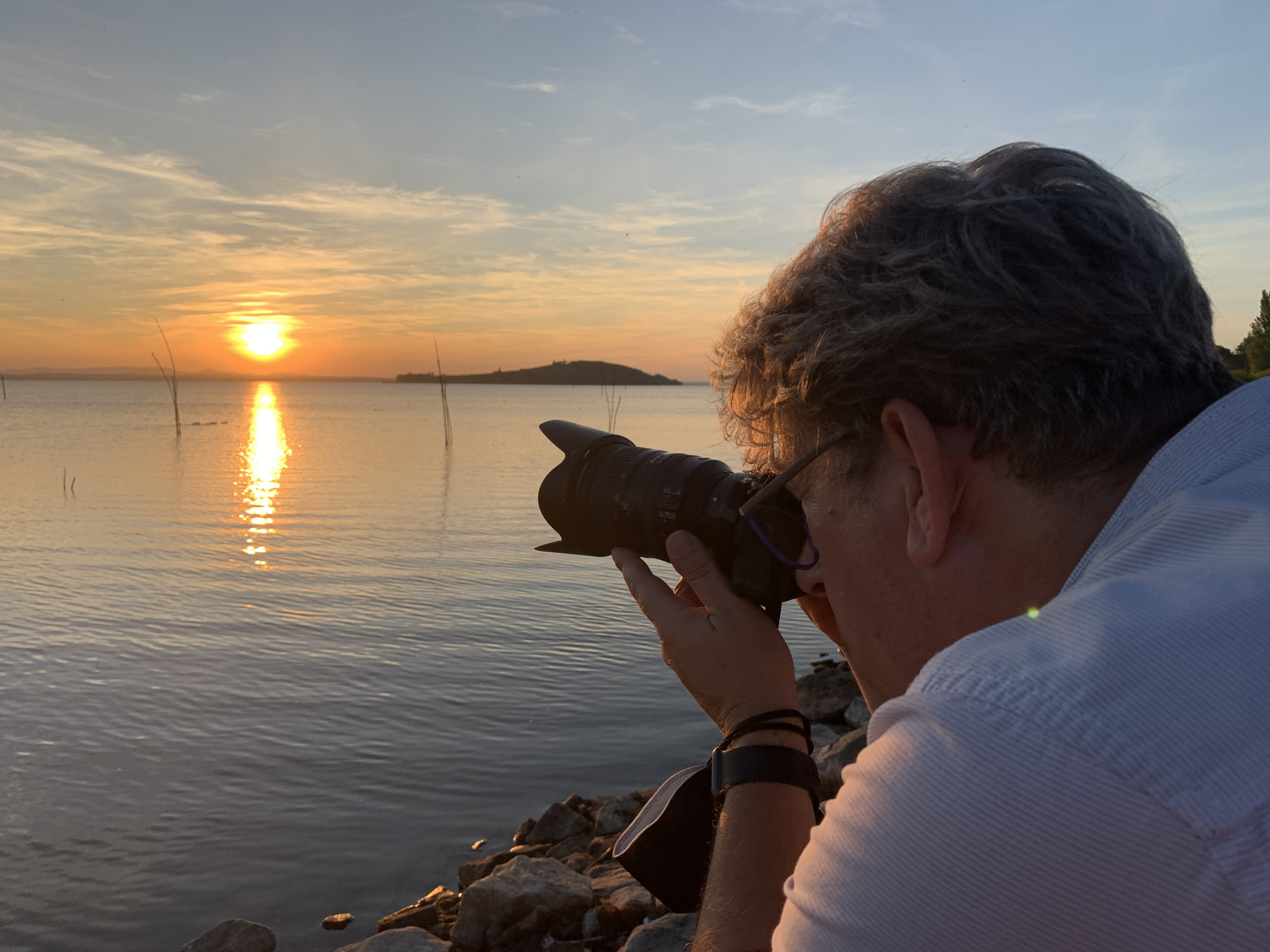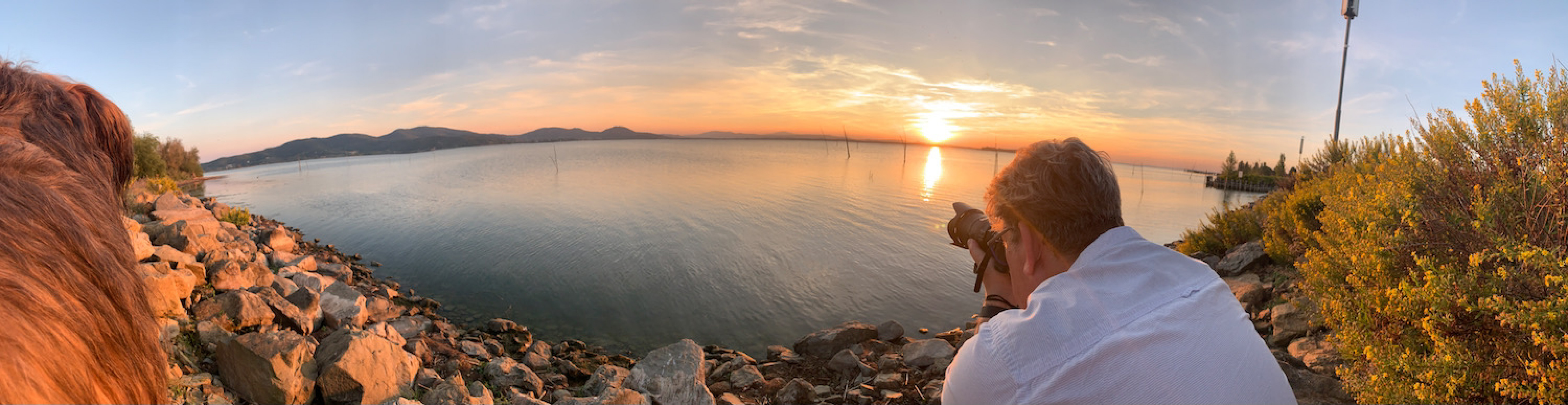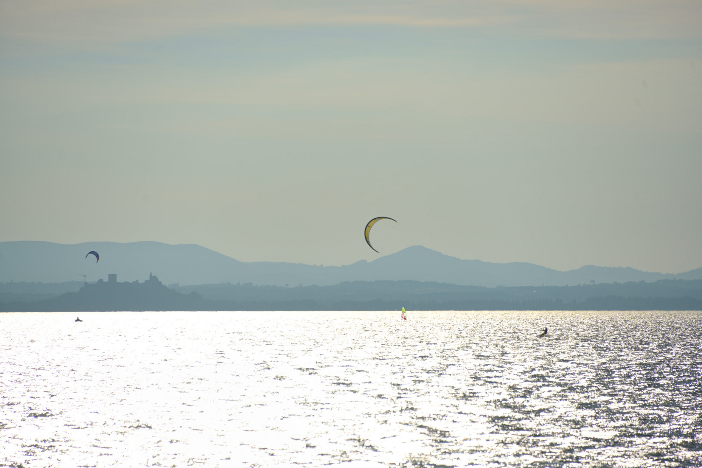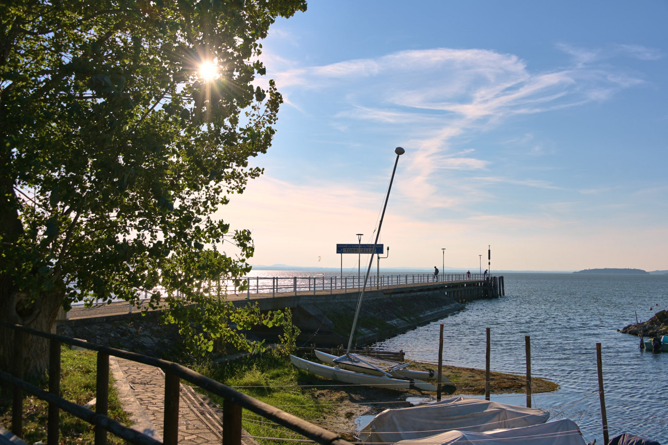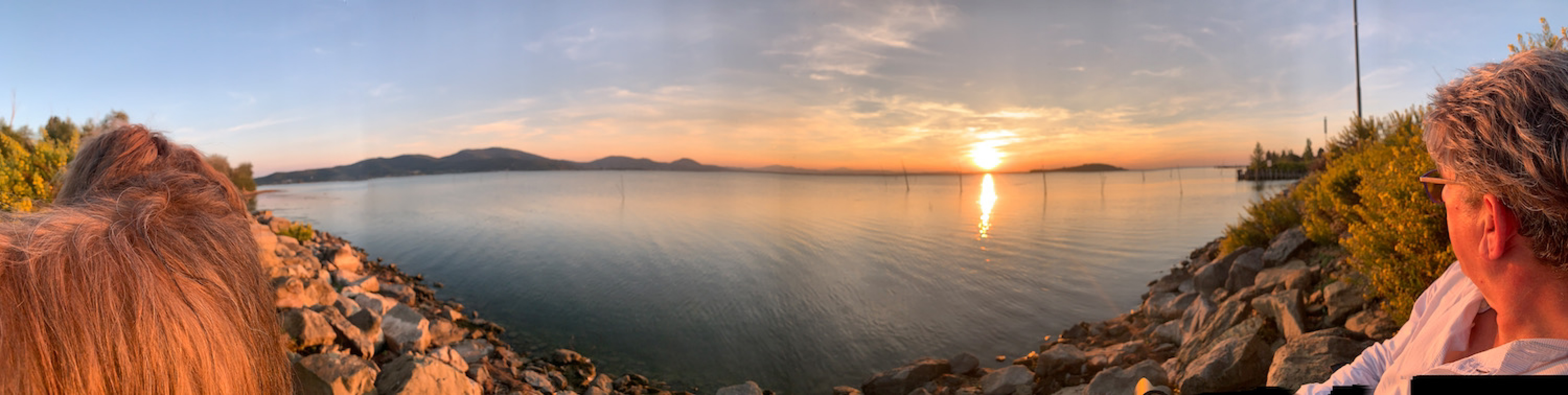 Nächster Halt „Spiaggia di Tuoro sul Trasimeno“ im Norden des Sees (2C) . Hier am Strand schlürfen wir gemütlich einen Kaffee und schauen den ganzen zwei vorhandenen Badegästen zu. Vom Anleger startet hier die Fähre zur „Isola Maggiore“. Den Skulpturenpark „Campo del Sole“ besuchen wir leider nicht, denn wir merken wieder einmal, wie die Zeit rennt und wir haben noch ein paar Stationen vor uns. Deshalb fällt der Stopp in „Passignano sul Trasimeno“, (2D) ebenfalls noch im Norden nur ganz kurz aus und auch in „Toricella“ (2E) im Osten des Sees verweilen wir nicht lang. Hier haben wir den Trasimenischen See schon im Juni besucht und im Anschluss unweit davon fürstlich gegessen. Wir schauen kurz den Windsurfern zu. Was uns aber bis hierher verfolgt ist das dreckige Wasser. Die braune Brühe, der braune Schlamm, alles immer in Ufernähe – nicht wirklich einladend. Liegt es vielleicht doch daran, dass die wenigen Zuflüsse zum See im Sommer austrocknen und kein sauberes Wasser bringen? Einen Abfluss gibt es auch nicht. Im Juni sah das Wasser noch wesentlich sauberer aus …