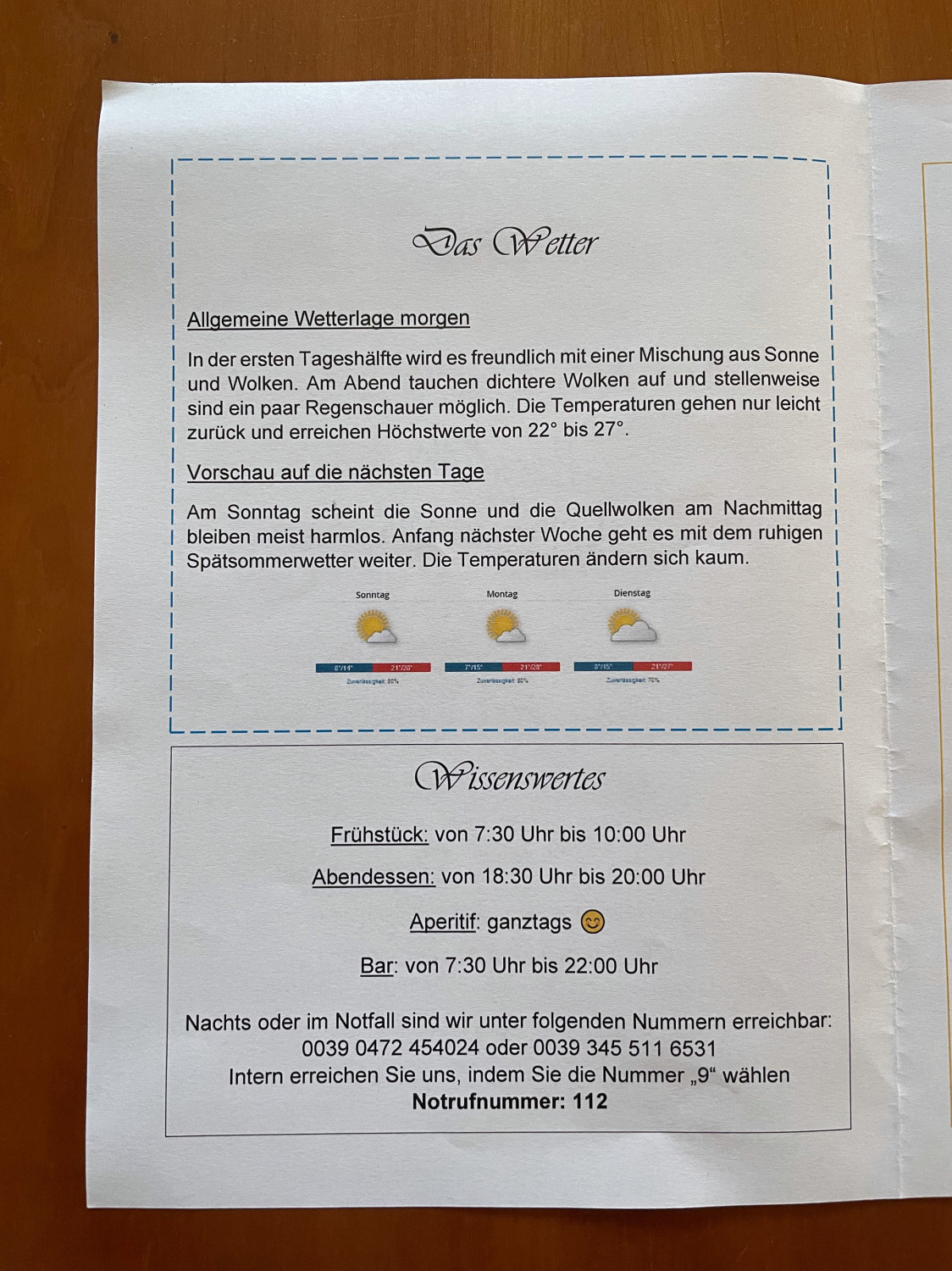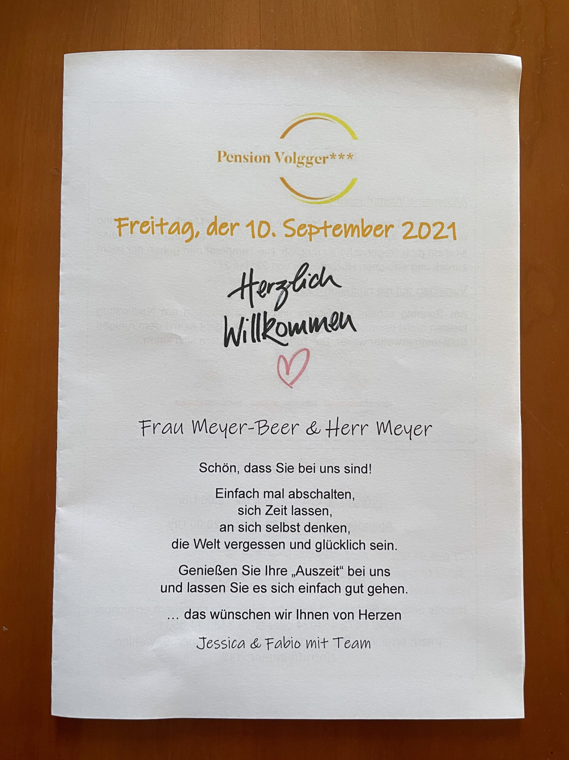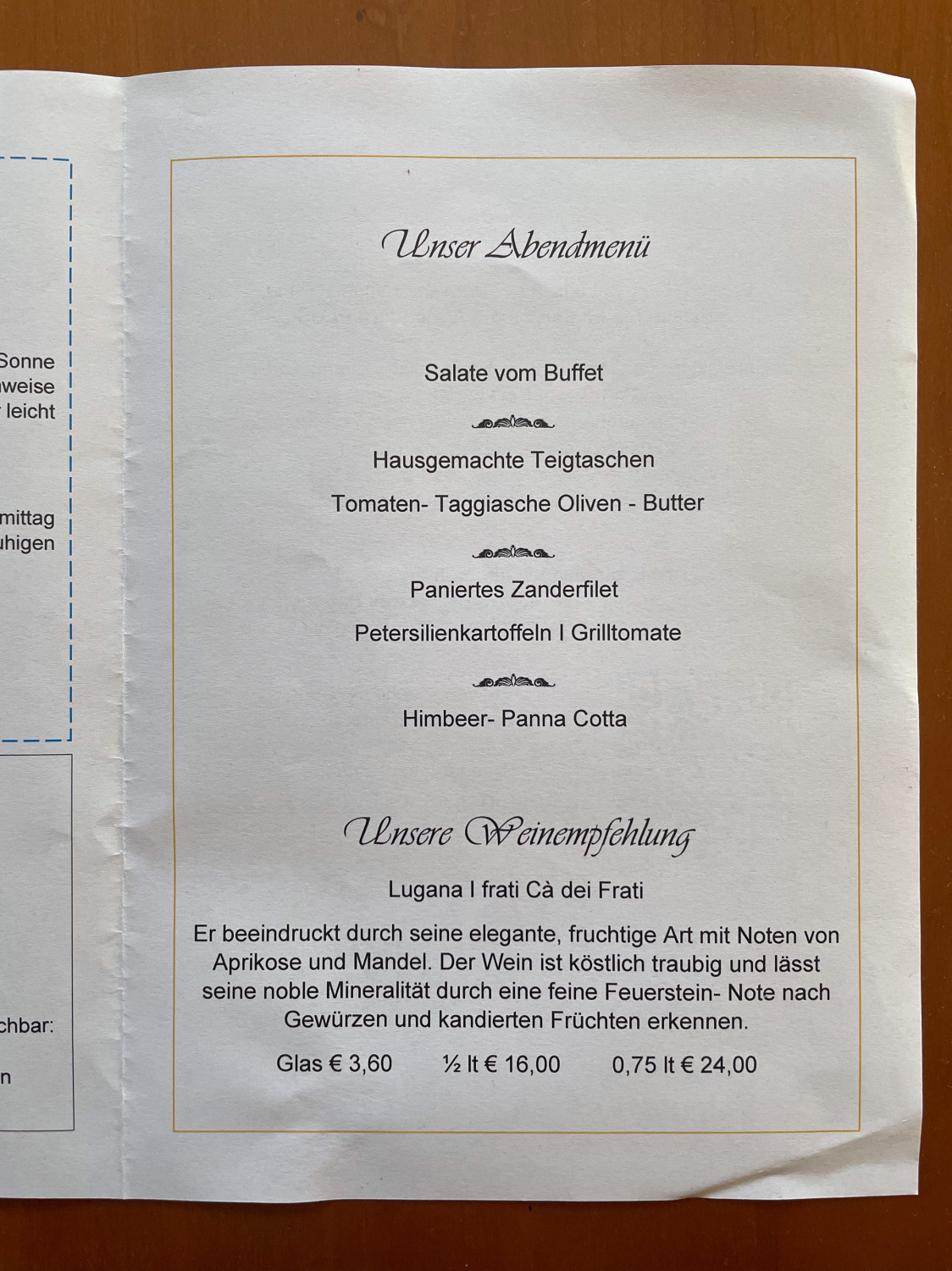 Das Abendessen genießen wir gleich in unserer Pension. Da wartet ein leckeres Drei-Gänge-Menü und eine Frisch-Salat-Bar auf uns, wie wir aus unserer persönlichen Willkommens- und Speisekarte entnehmen. Eine leckere Flasche Wein ist noch der krönende Abschluss für diesen schönen und entspannten Tag.