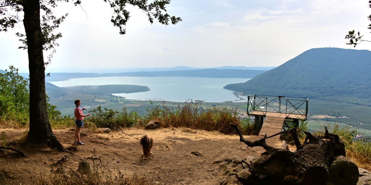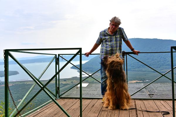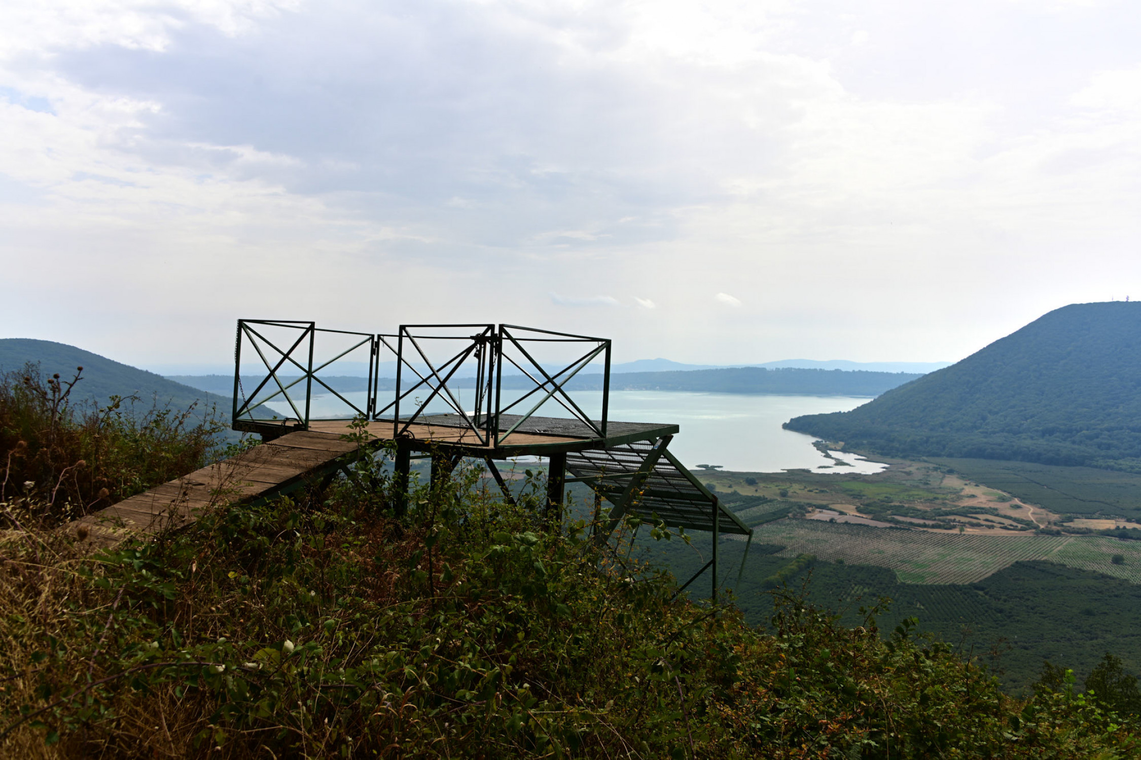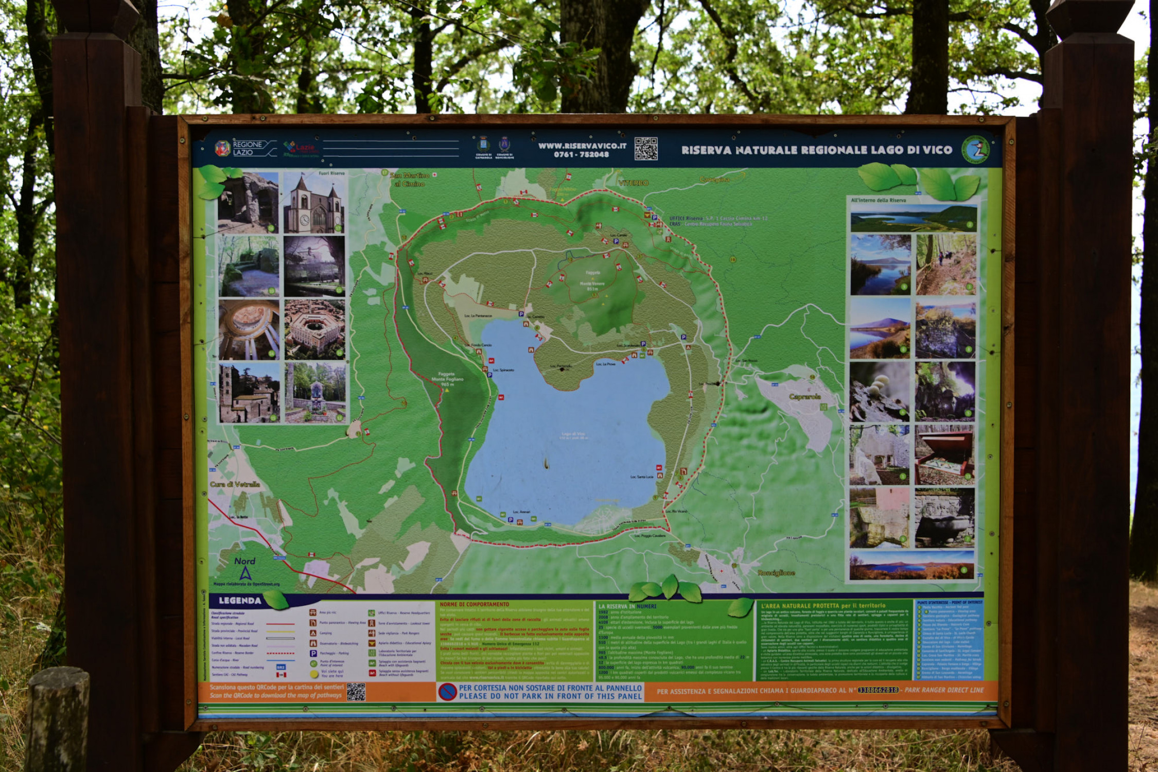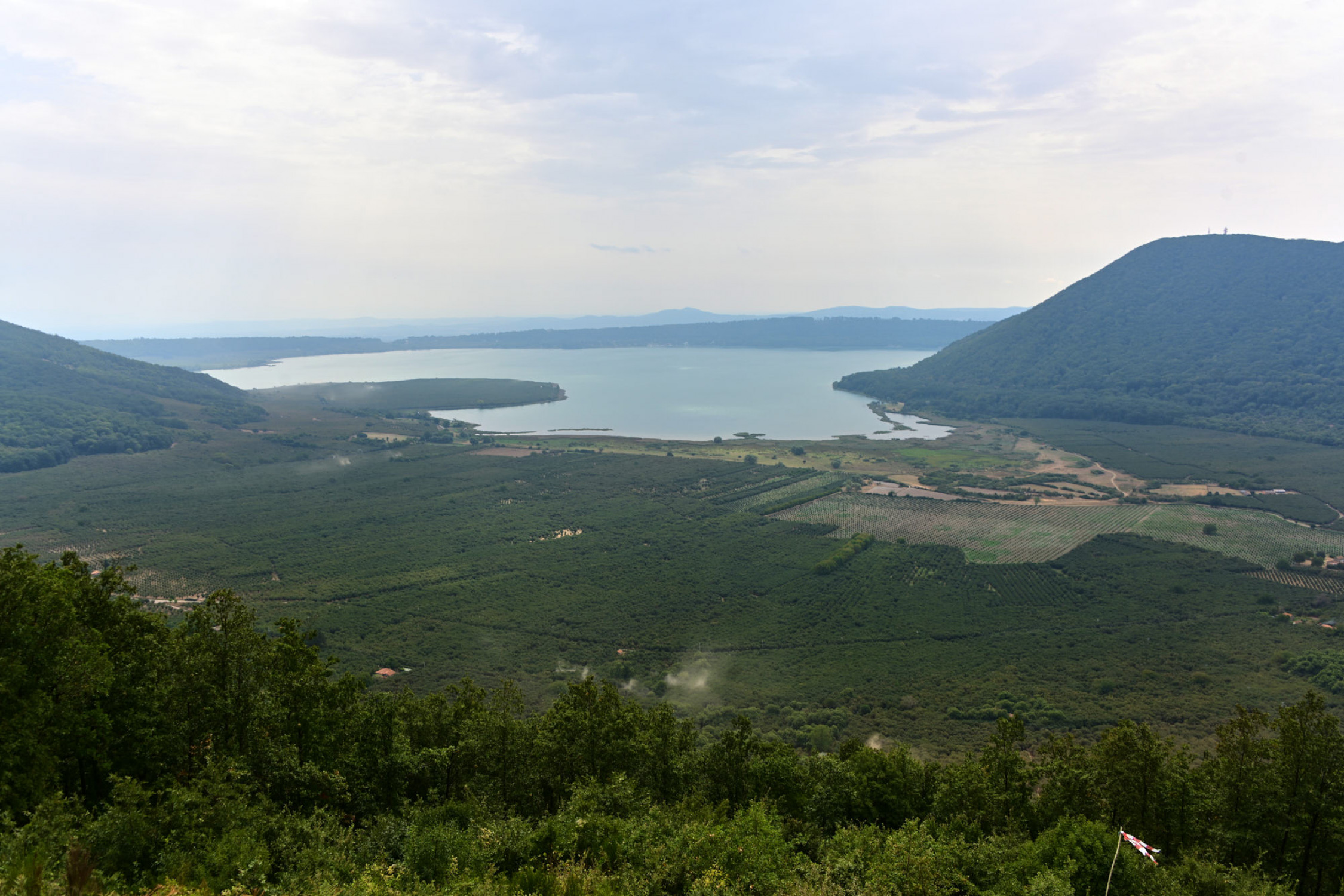 Der Vicosee, ein Kratersee vulkanischen Ursprungs, liegt in 510 m Höhe südöstlich von Viterbo. Umgeben wird er von der felsigen Hügelkette der Monte Cimini mit dem Monte Fogliano und dem Monte Venere als höchste Erhebungen. Einen herrlichen Panoramablick über den Vico-See eben – zwischen diesen beiden Bergen – erhaschen wir in 840 m Höhe vom Aussichtspunkt „Belvedere di Poggio Trincera“. Hier weht ein frischer Wind, es ist echt kalt "hier oben" und leider ist es ziemlich bewölkt und trüb, also schlecht fürs Foto …